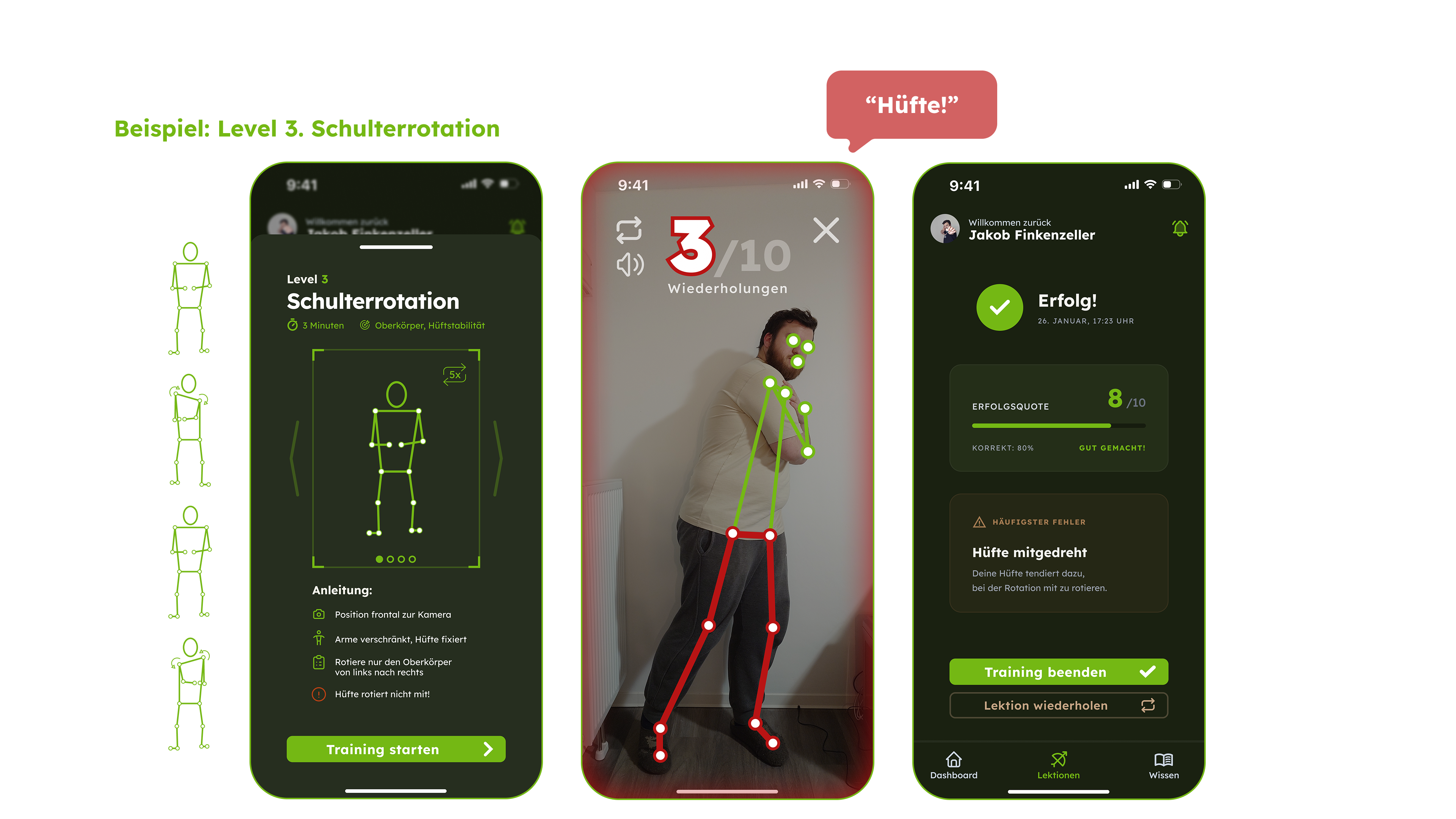 Das System nutzt Computer Vision (Google’s MediaPipe), um die Körperhaltung des Schützen über die Frontkamera zu analysieren und in Echtzeit auszuwerten. Dabei positioniert sich die Anwendung nicht als Ersatz für den Vereinstrainer, sondern als ergänzendes Werkzeug zur Qualitätssicherung im Heimtraining.