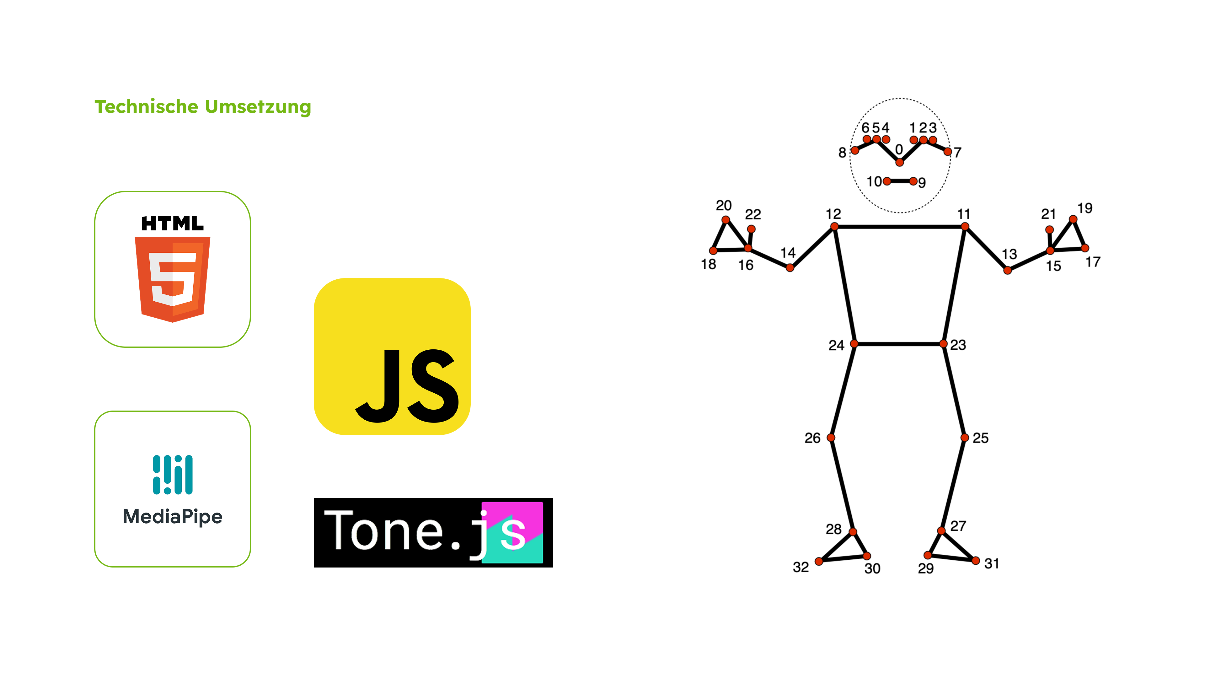 Im Rahmen der Arbeit wurde ein funktionaler Web-Prototyp entwickelt, der die Machbarkeit der Bilderkennung im Browser demonstriert. Die technische Umsetzung basiert auf MediaPipe Pose für das Tracking von 33 Körper-Keypoints sowie Tone.js für das Echtzeit-Audio-Feedback.