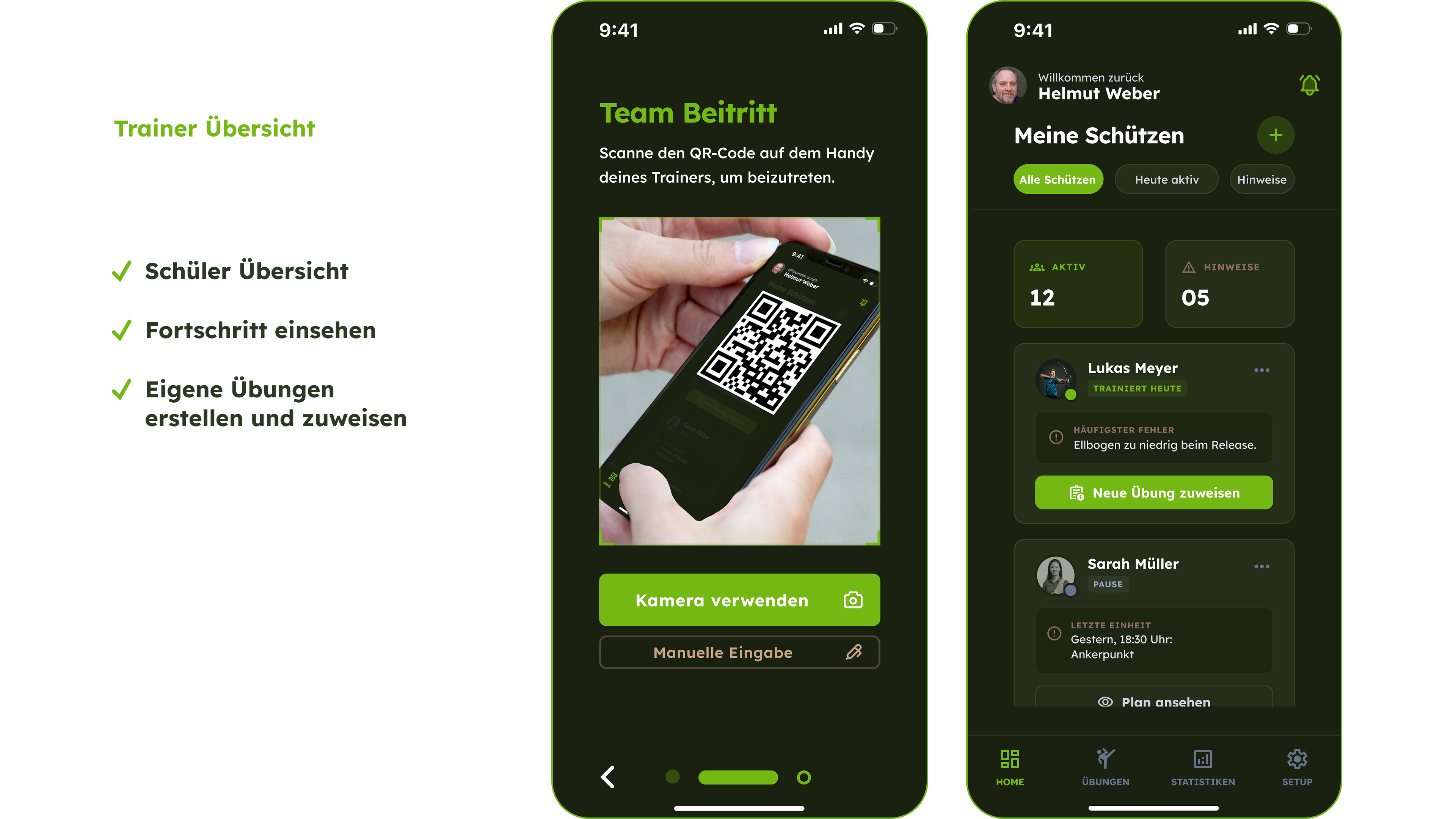 Um die fachliche Korrektheit zu gewährleisten, ist das System eng an den Vereinstrainer gekoppelt. Über ein webbasiertes Dashboard kann der Trainer Übungspläne erstellen und den Fortschritt seiner Schützen asynchron einsehen.