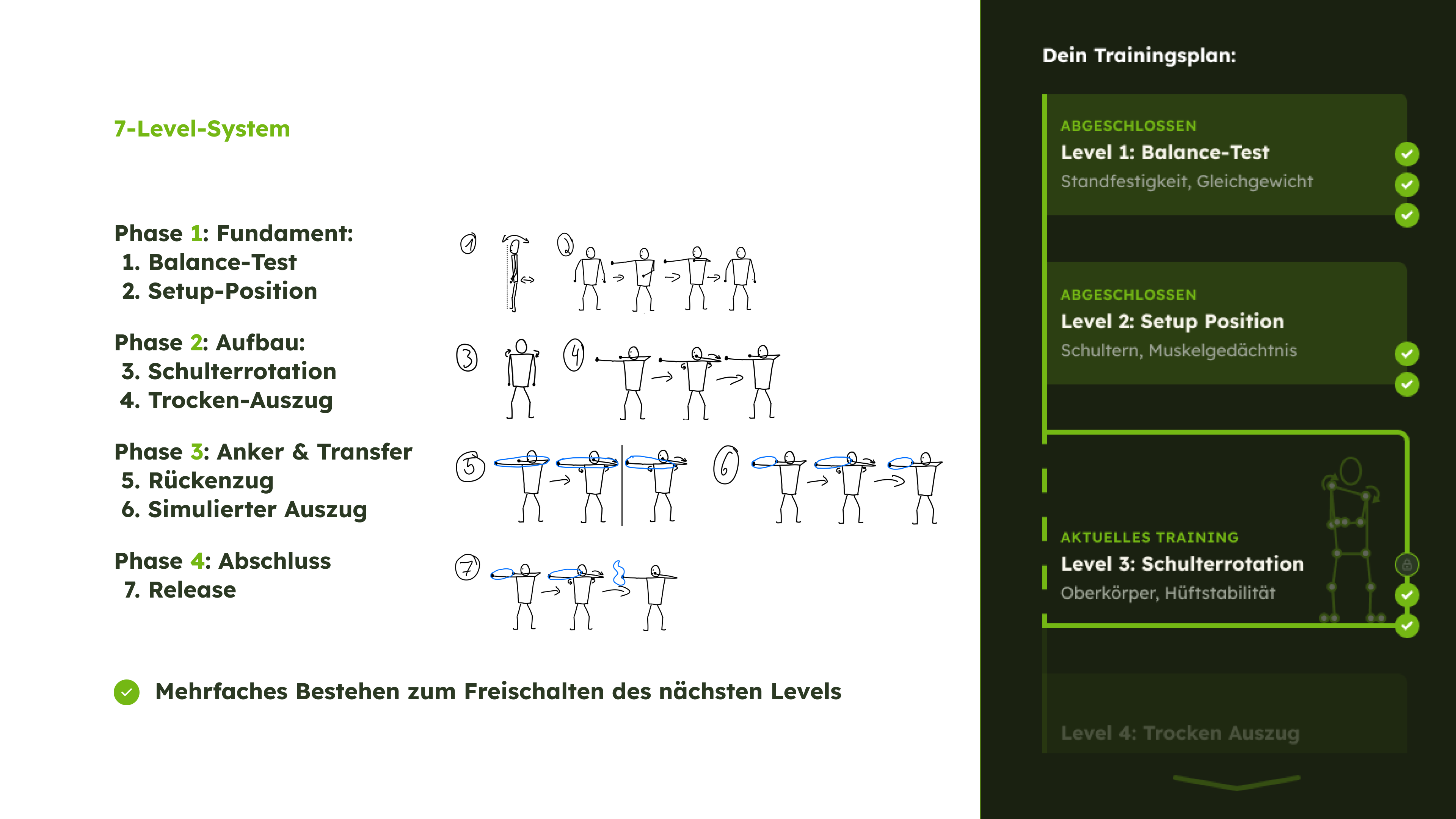 Die Anwendung dekonstruiert den komplexen Schussablauf in sieben isolierte Lektionen, die in vier Phasen gegliedert sind (Fundament, Aufbau, Anker, Abschluss). Das System erzwingt dabei ein nachhaltiges Lerntempo: Um das nächste Level freizuschalten, reicht ein einmaliger Erfolg nicht aus.
