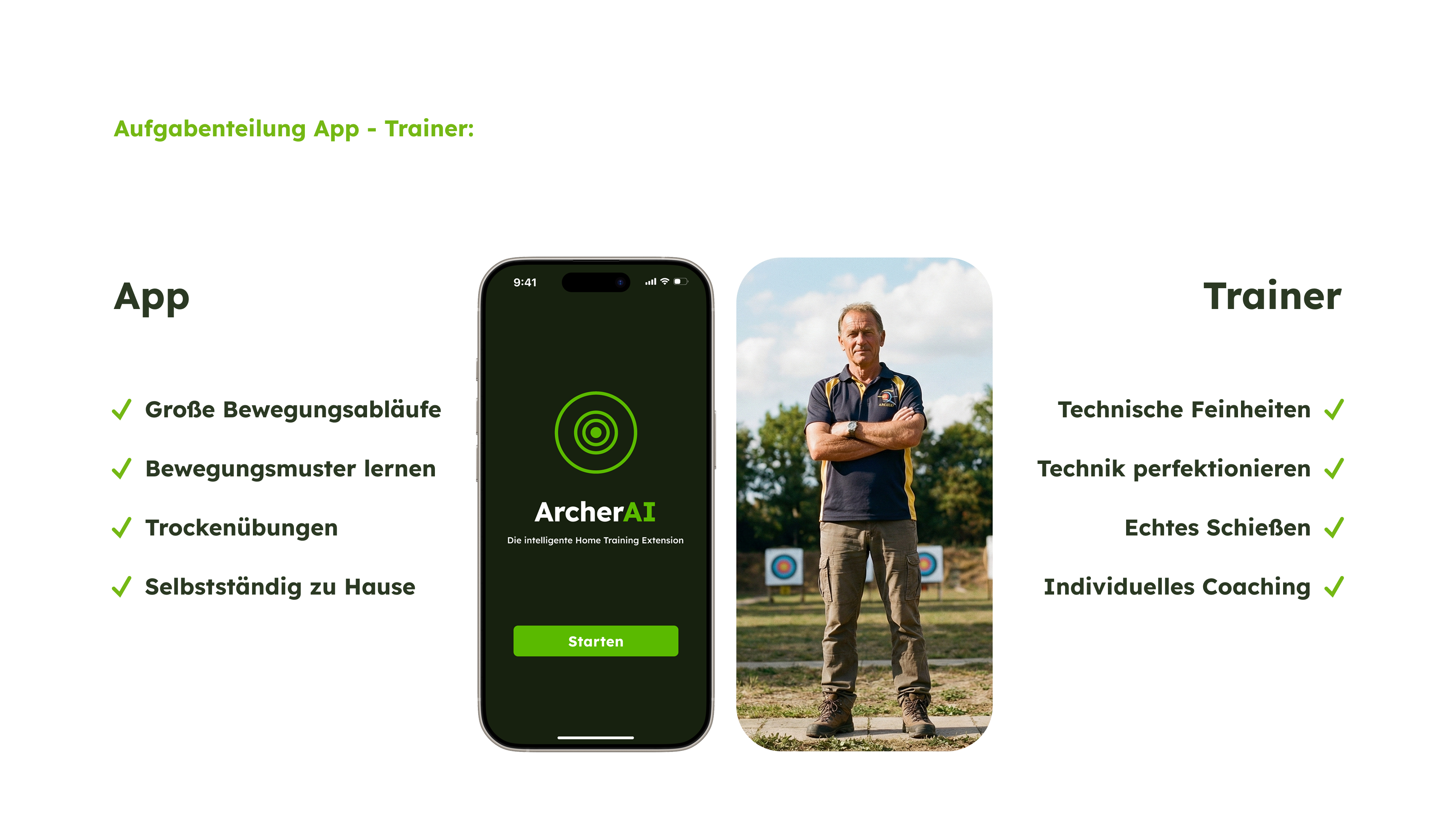 Vereinstrainer (Mensch): Konzentriert sich auf feinmotorische Details (z.B. Fingerhaltung, Release, mentale Aspekte) und die Arbeit mit Pfeil und Bogen auf der Schießbahn.