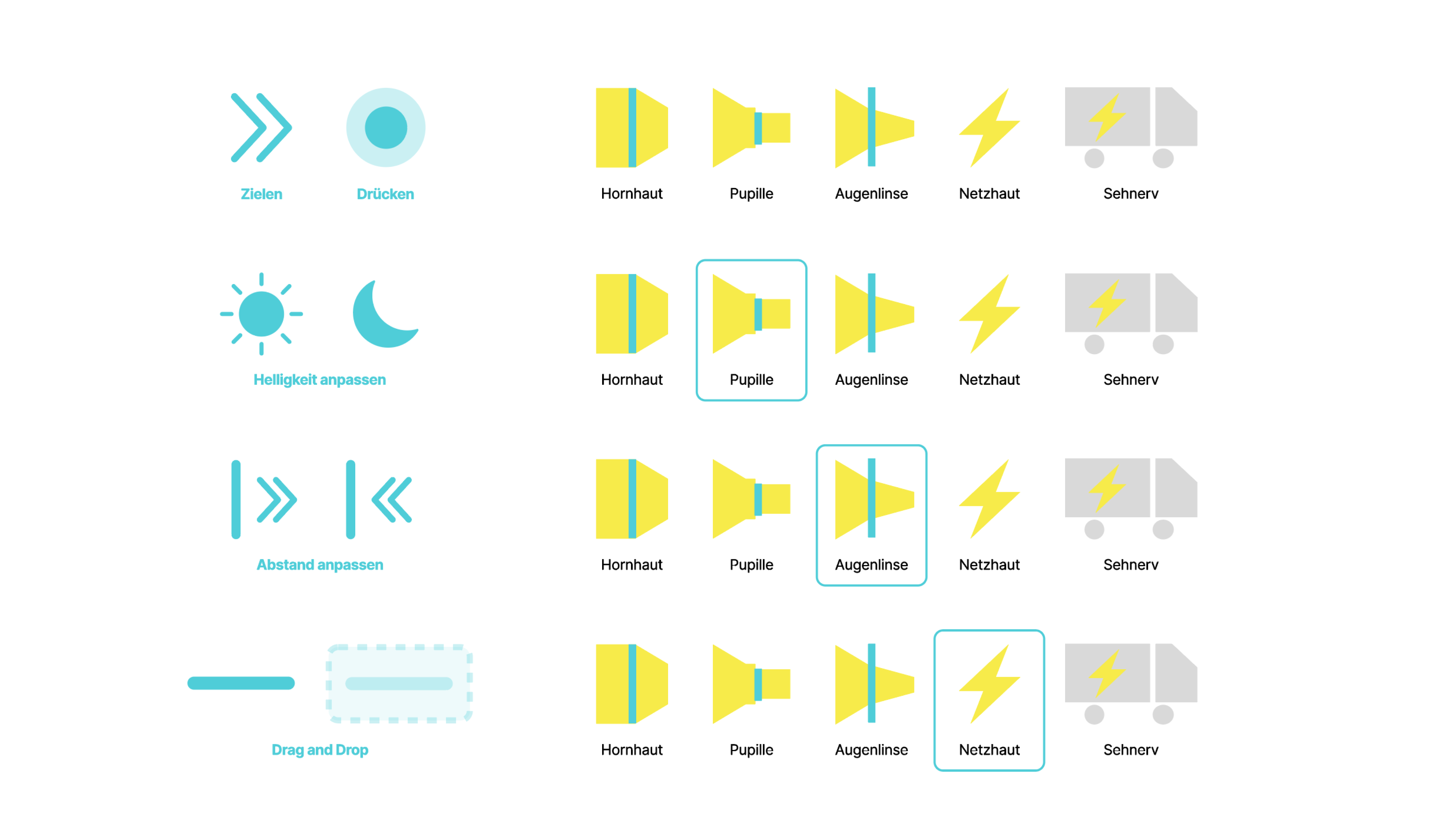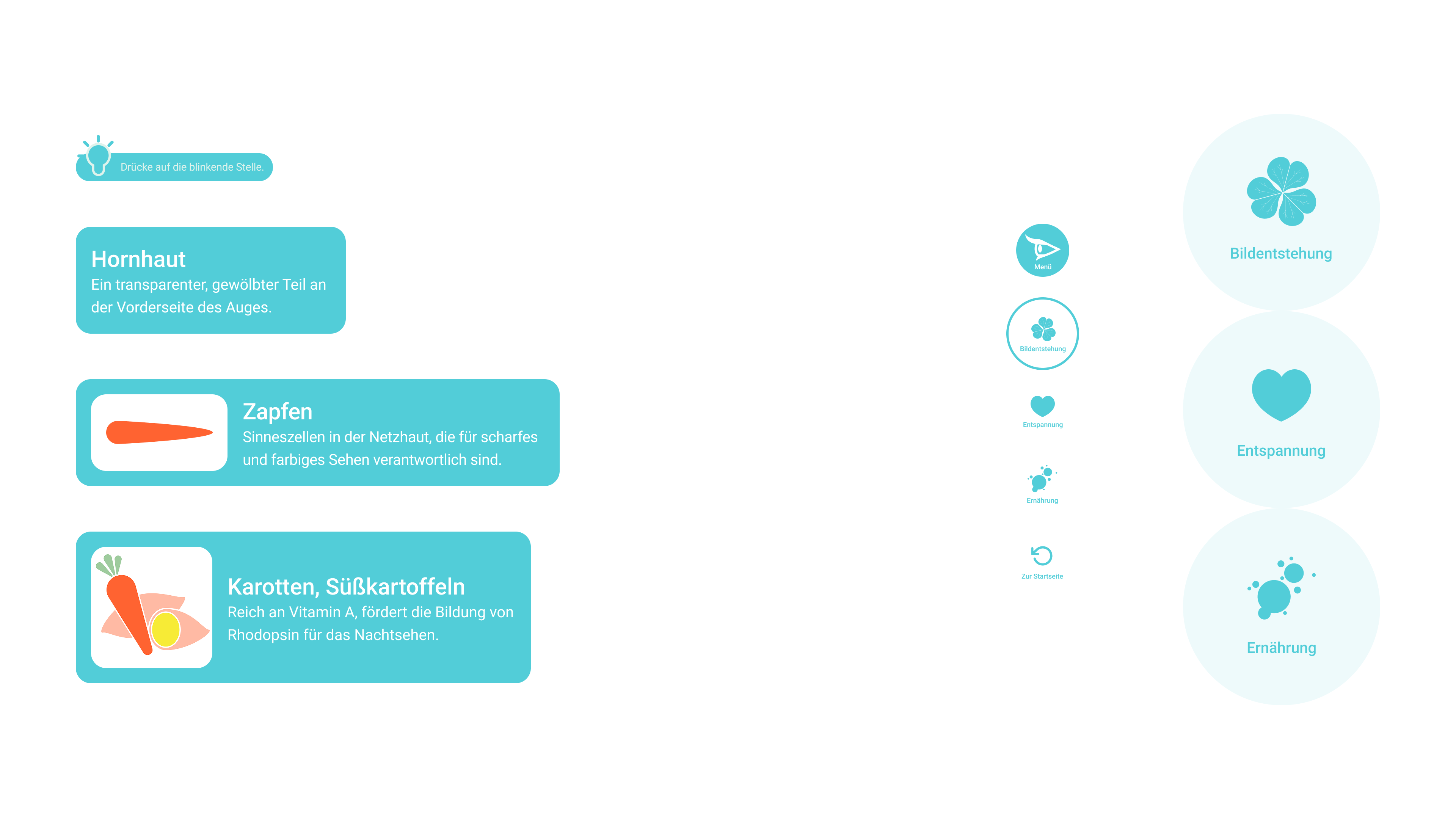 Inhaltlich beschäftigt sich das Projekt mit dem Auge – was es ist, wie es funktioniert und wie man die Augen im Alltag schützen kann. Ziel ist es, komplexe Informationen verständlich aufzubereiten und durch eine intuitive Gestaltung einen niederschwelligen Zugang zum Thema zu ermöglichen.