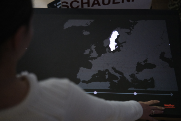 Ein integriertes iPad zeigt in drei Stufen Gewalt als Projektion an der Wand hinter dem Objekt. Ergänzt wird die Installation durch einen interaktiven Medientisch, auf dem man per Touch durch eine Zeitleiste zur Entwicklung des Hilfetelefons in Europa springen kann. So wird deutlich, wie spät sich diese Unterstützung verbreitet hat.