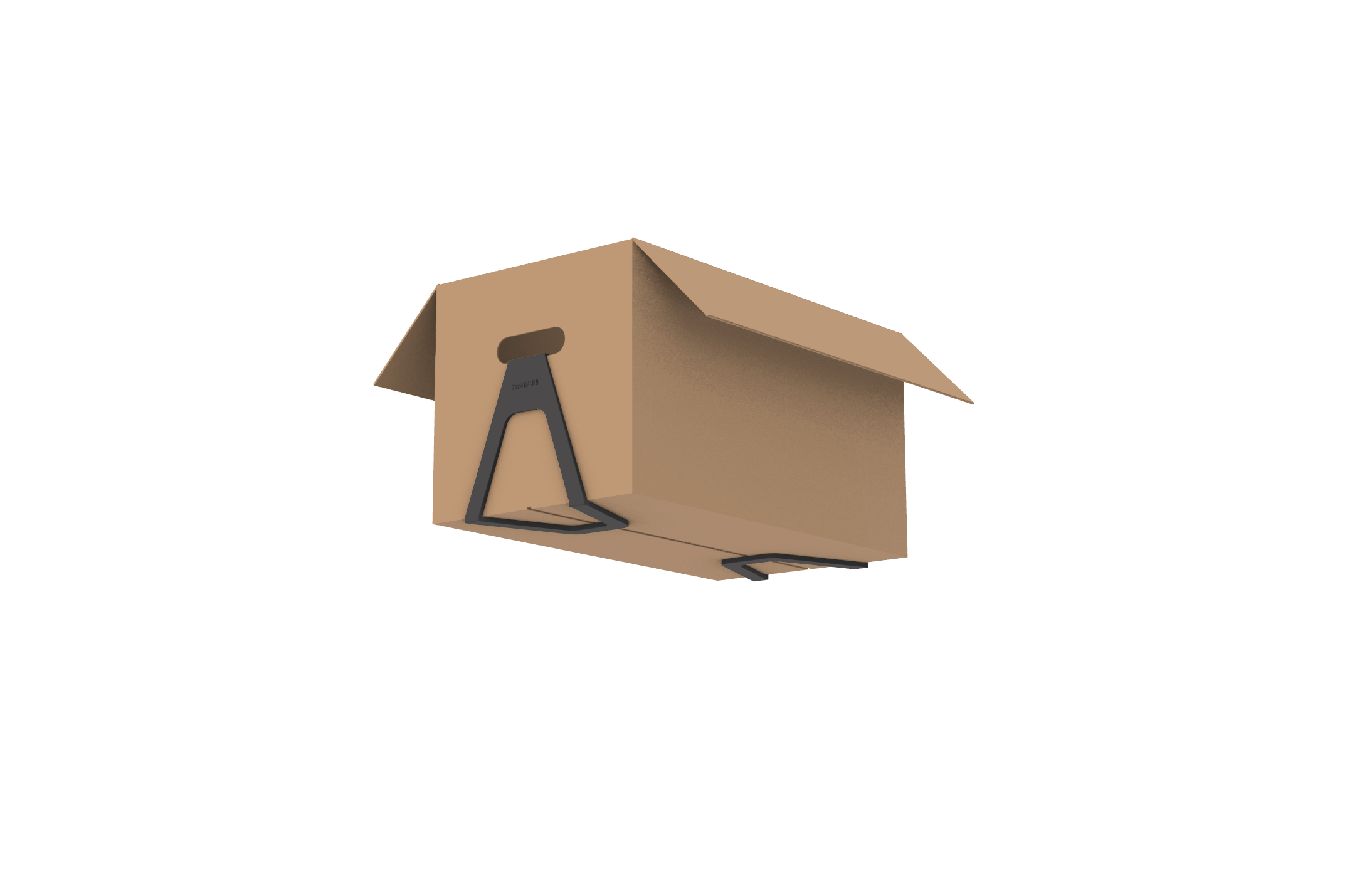 Der Winkel wird vor dem Befüllen seitlich zwischen Griffaussparung und Kartonboden eingehakt. Die Montage erfolgt ohne Werkzeug und kann einfach entfernt und erneut verwendet werden.