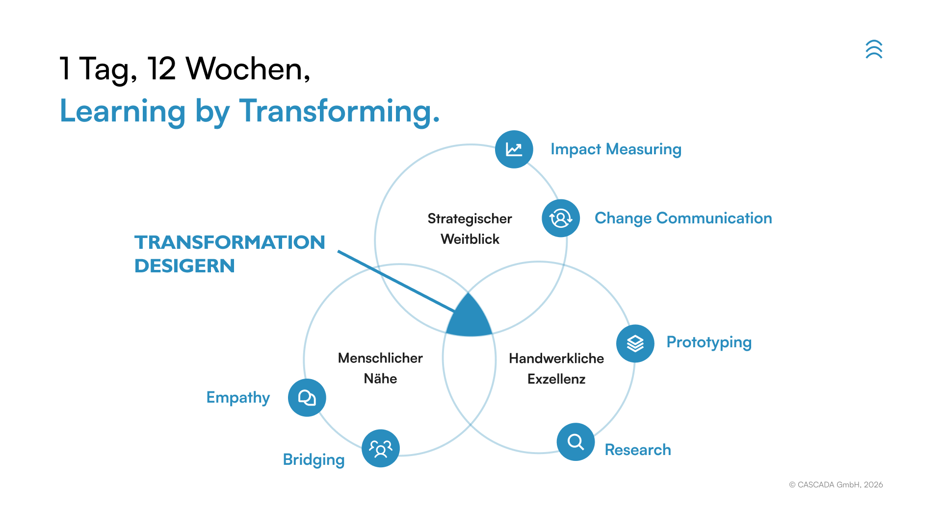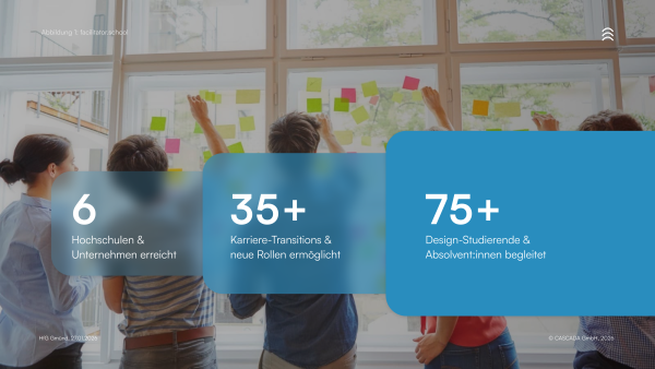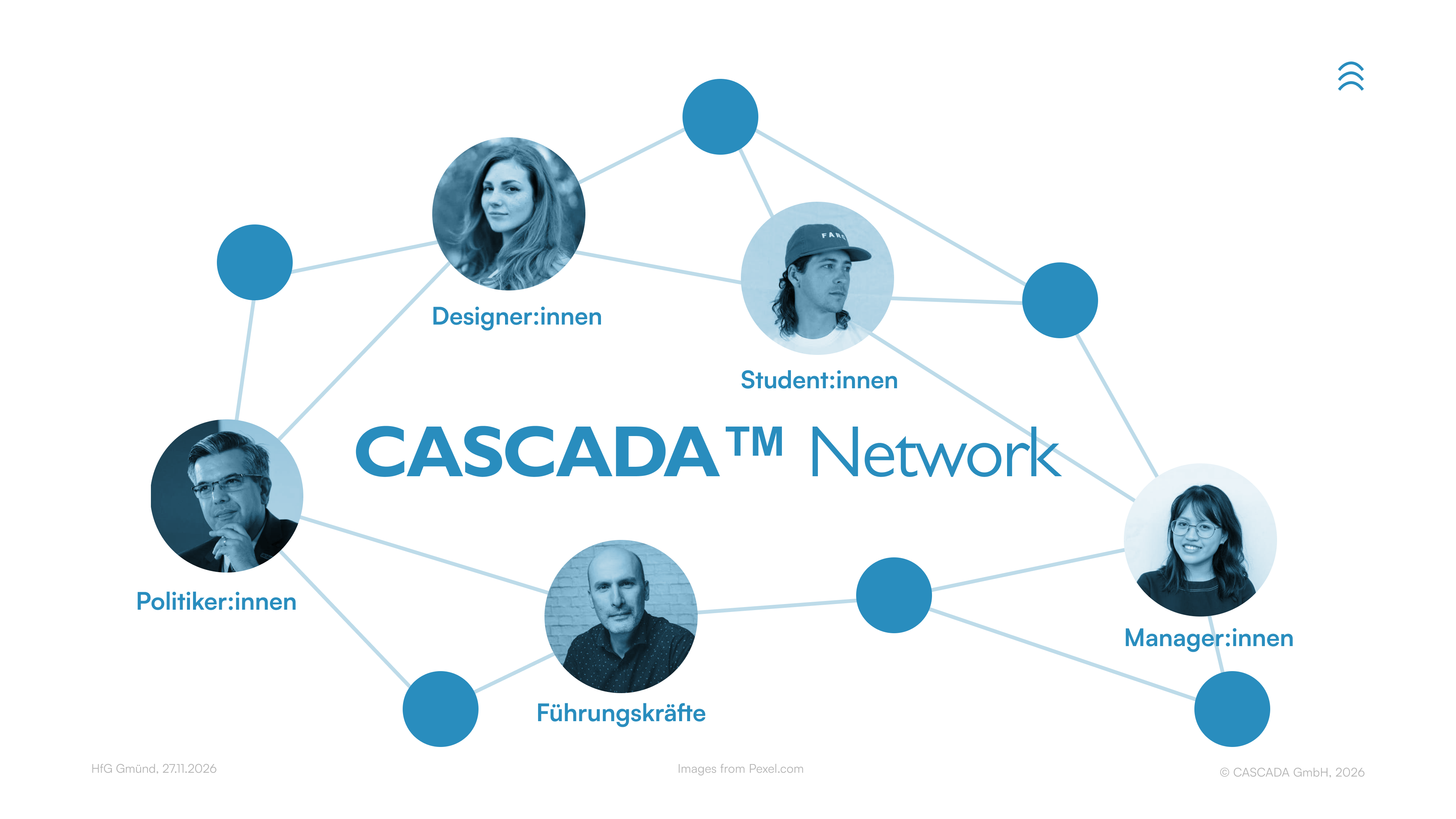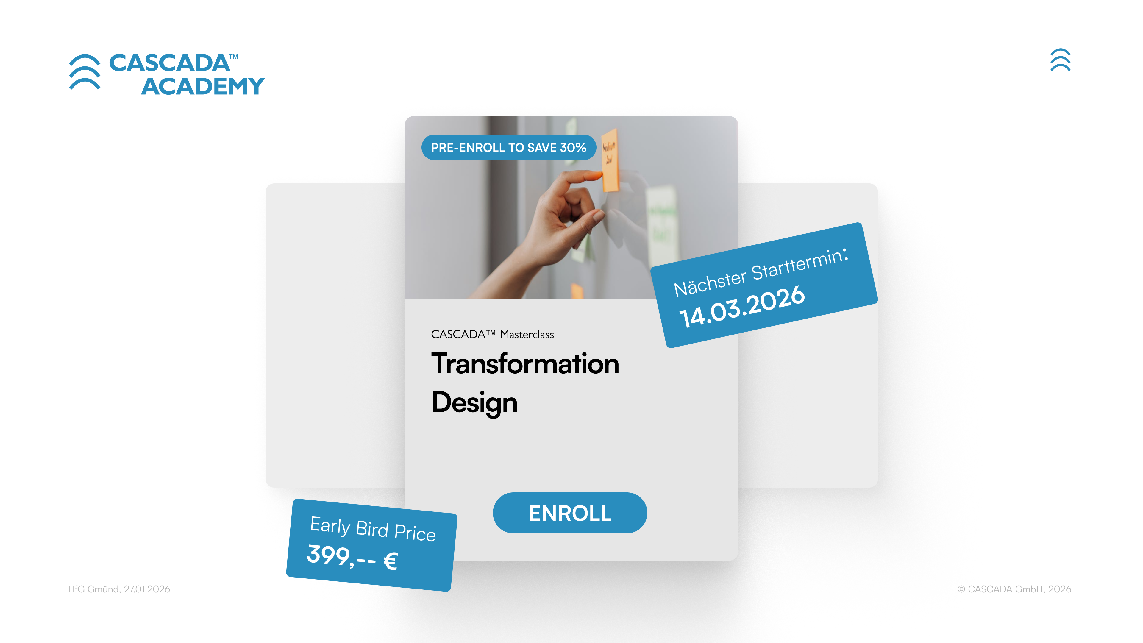 Die Masterclass Transformation Design der CASCADA ACADEMY ist mehr als ein Fortbildungskurs – sie ist ein Karriere-Inkubator. In 12 Wochen lernst du, Designskills nicht nur für die Verpackung, sondern als Hebel für echte strukturelle Veränderung zu nutzen. Wir arbeiten direkt mit Partnerunternehmen zusammen, sodass du nicht im theoretischen luftleeren Raum lernst, sondern echte Business-Probleme löst. Das Ziel: Transformation nicht nur begleiten, sondern wirksam machen.