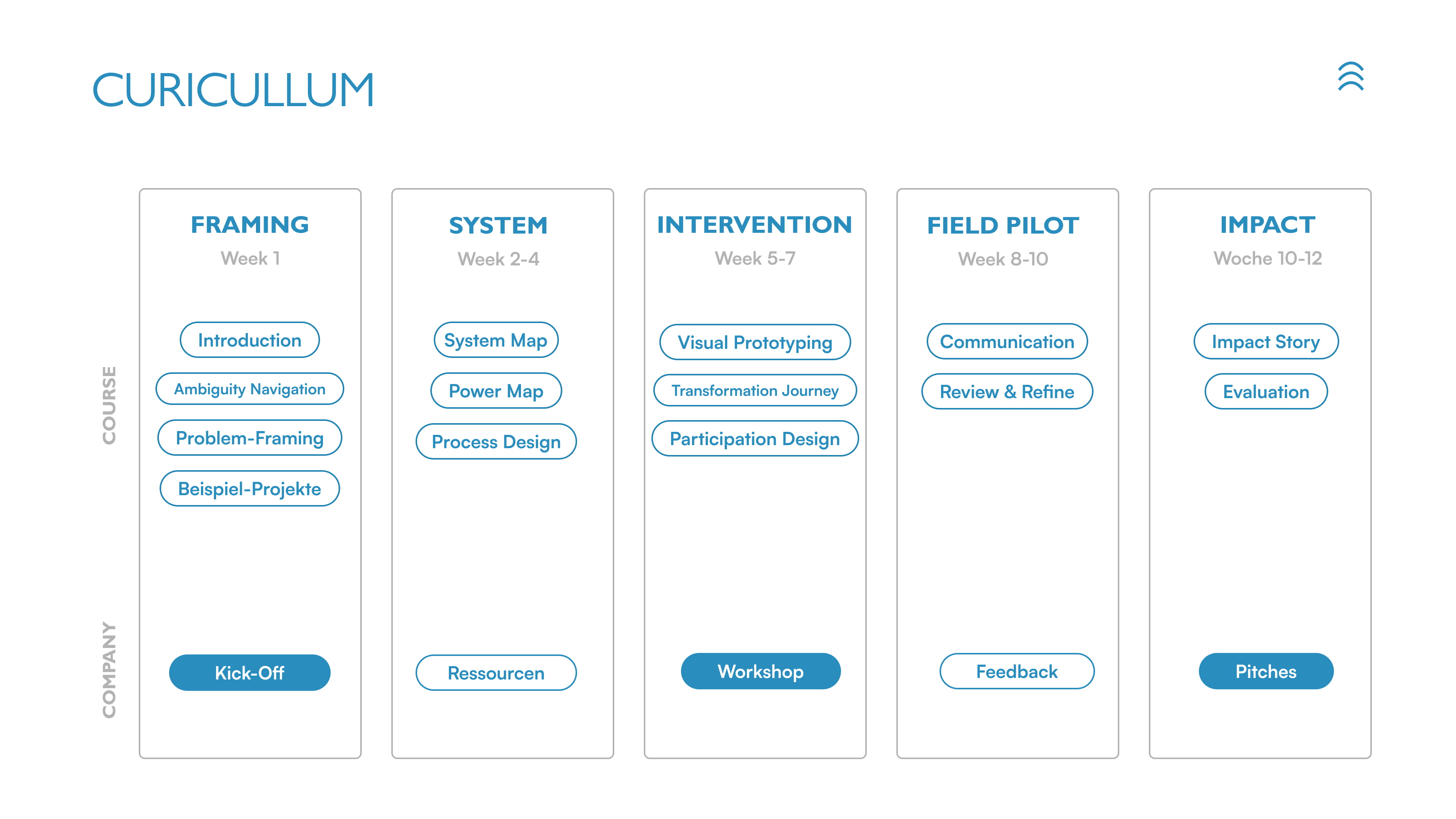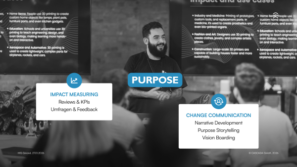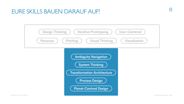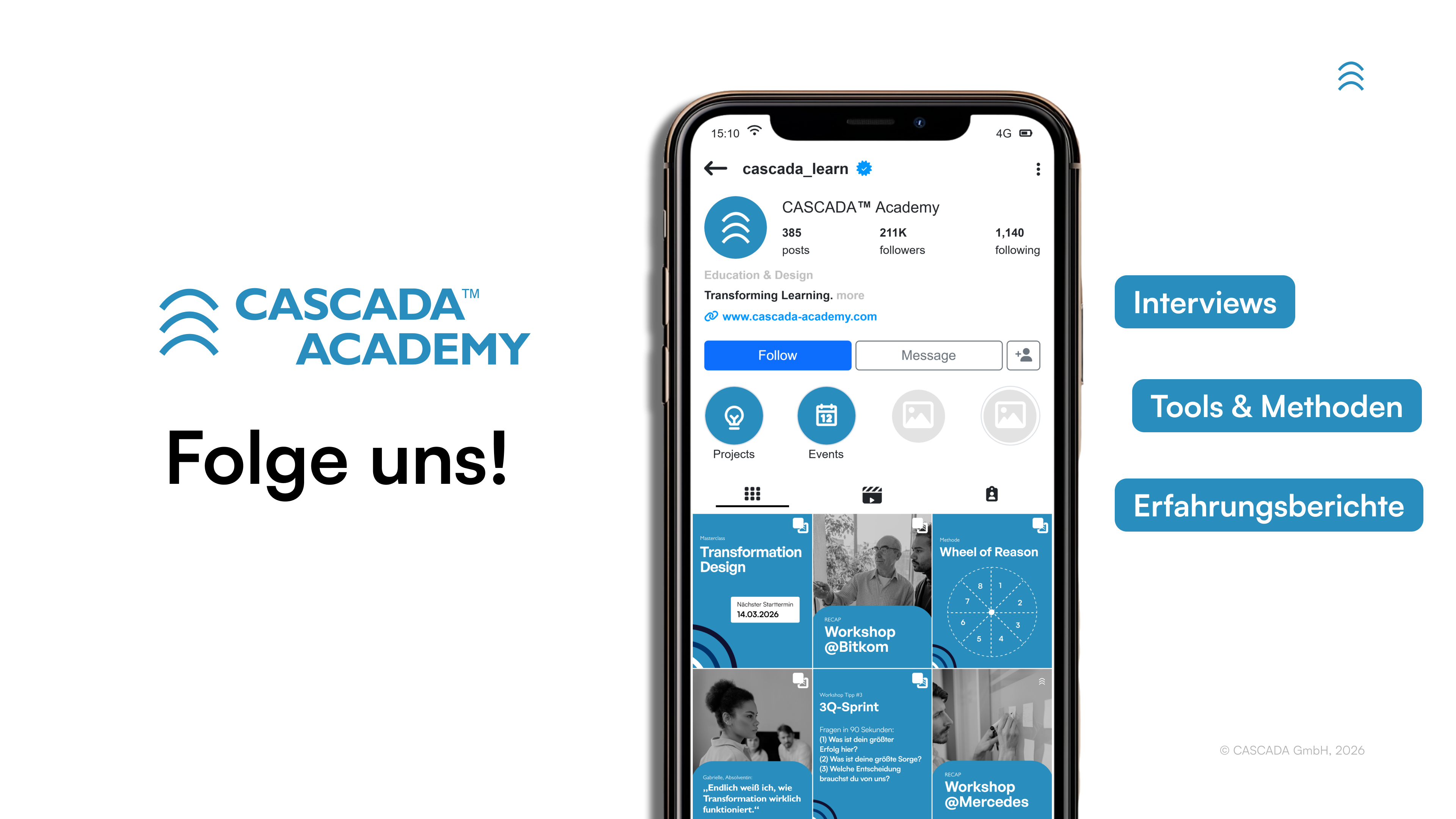 Die Masterclass Transformation Design der CASCADA ACADEMY ist mehr als ein Fortbildungskurs – sie ist ein Karriere-Inkubator. In 12 Wochen lernst du, Designskills nicht nur für die Verpackung, sondern als Hebel für echte strukturelle Veränderung zu nutzen. Wir arbeiten direkt mit Partnerunternehmen zusammen, sodass du nicht im theoretischen luftleeren Raum lernst, sondern echte Business-Probleme löst. Das Ziel: Transformation nicht nur begleiten, sondern wirksam machen.