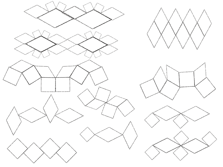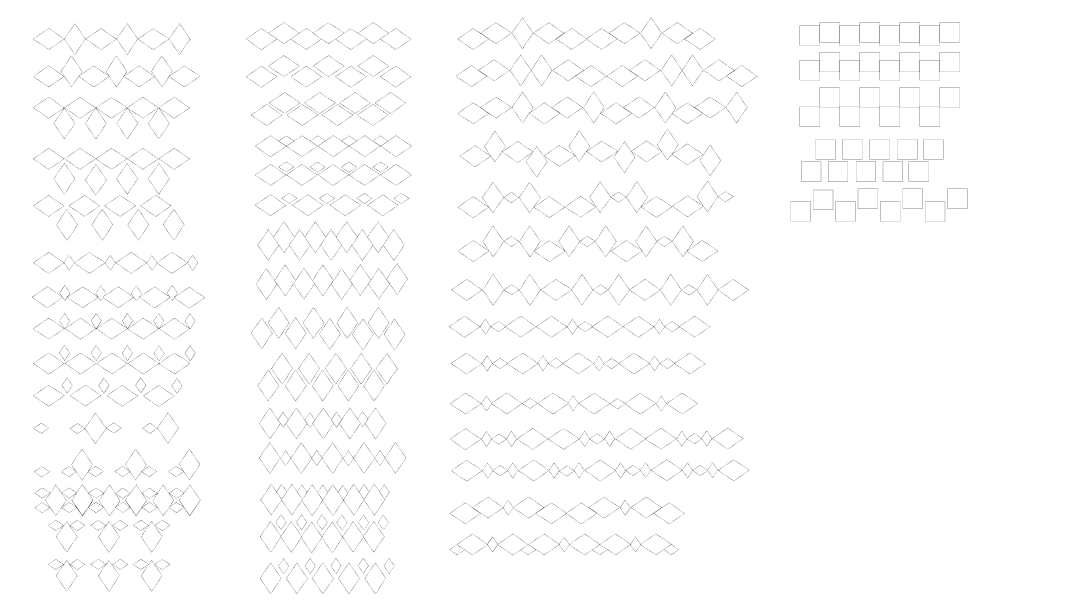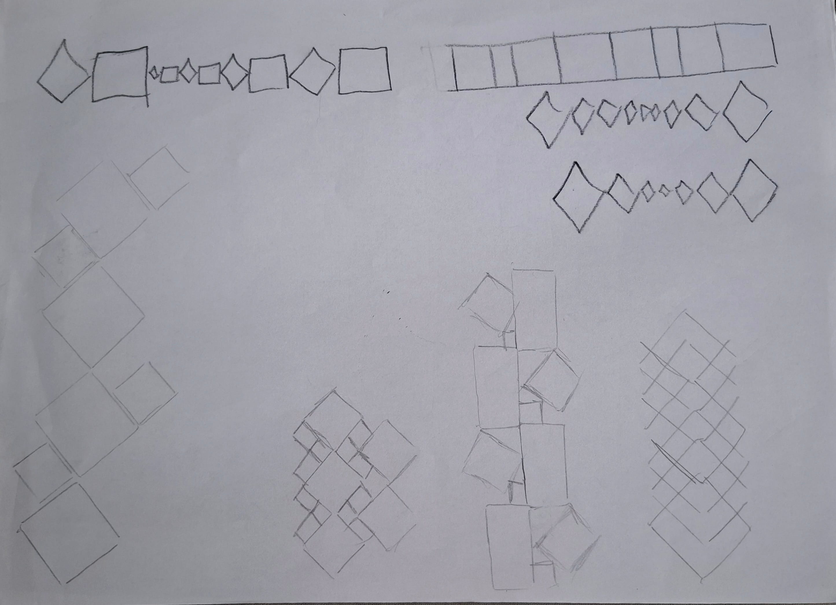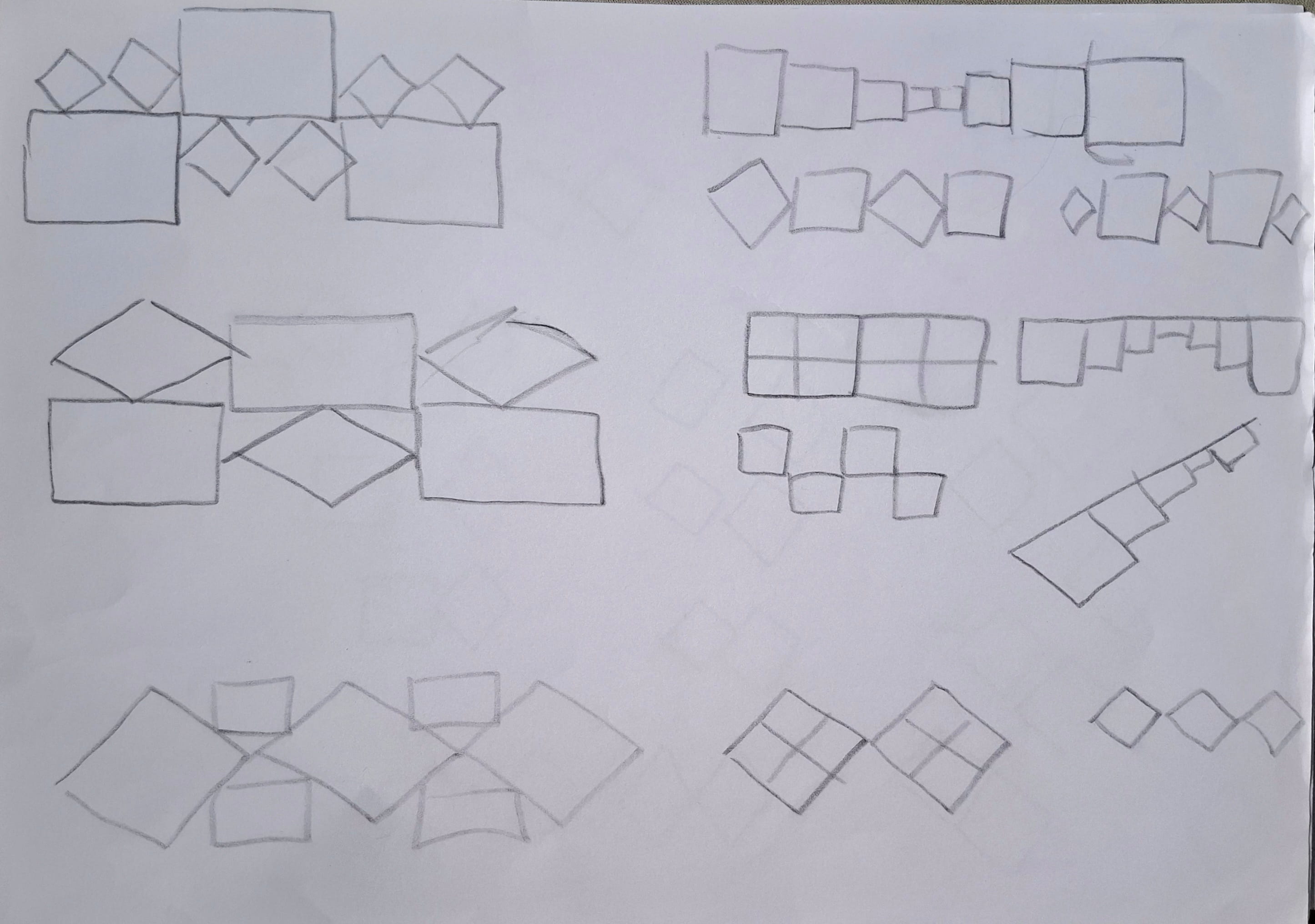 Die Rechtecke sollten jetzt nicht nur einzeln nebeneinander stehen und aufeinander wirken, sondern auch komplexer werden indem man mehrere hintereinander reiht. Mit der Zeit hat sich das Rechteck mehr zu einer Raute entwickelt.