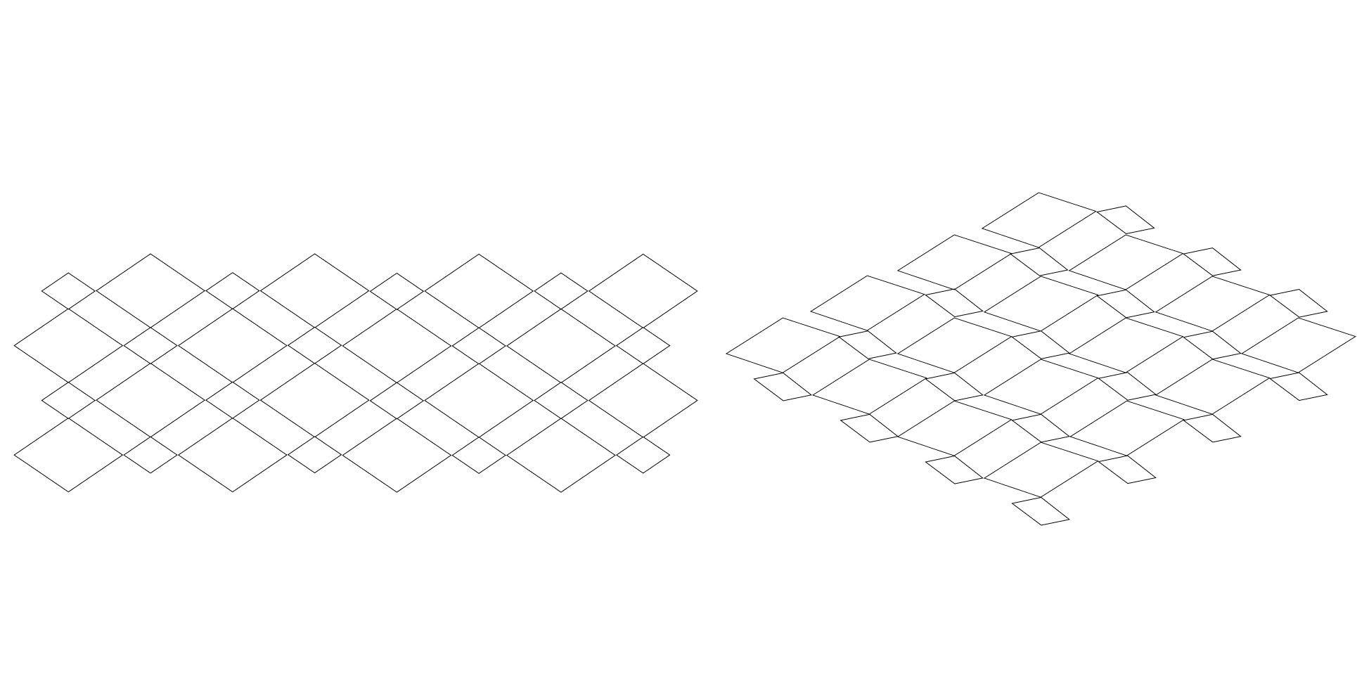 Die Grundidee der Parkettierung ist eine Raute, die an jeder Spitze eine nur halb so kleine Raute liegen hat. Zwischen den Rauten scheinen dann langgezogene Parallelogramme zu liegen. Dadurch entsteht ein Muster, welches sich äußerlich stark an ein lang gezogenes Vichy-Karo Muster ähnelt. Wenn man dieses nochmal verzieht und Farbe gibt, dann scheint es wie mehrere aneinander liegende Würfel.