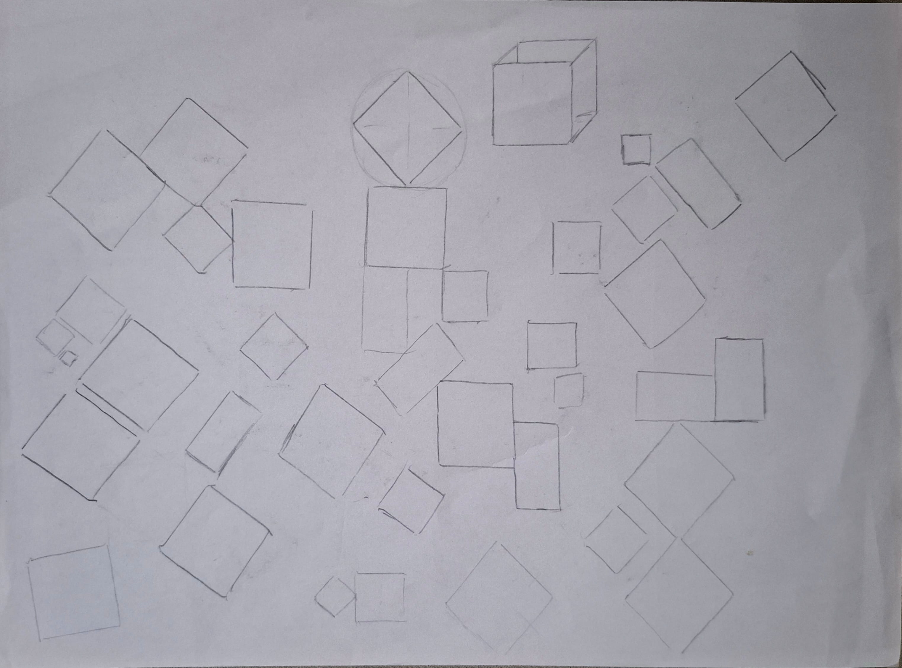 Die Erstellung von Cubus begann erstmal mit der Erstellung von Skizzen auf Papier. Nach langem überlegen und probieren habe ich mich für die Grundform Rechteck entschieden. Dieses sollte neben einem anderen Rechteck stehen, wobei das eine auf eine Weise: rotiert, vergrößert, oder der Abstand verändert werden sollte.