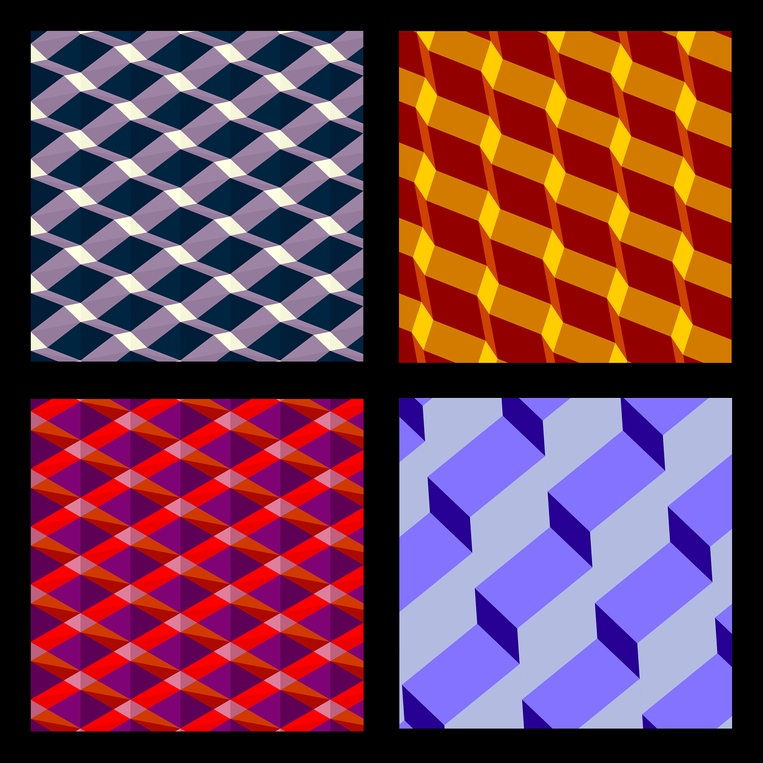 Cubus ist eine Parkettierung, welche aus mehreren aneinandergereihten Rauten und Parallelogrammen entstanden ist. Dieses Muster hat allerdings die Besonderheit, dass man diese Formen so verzerren kann, dass sie wie 3-dimensionale Würfel dargestellt sind. Mit der Einführung von Farbe scheint es als würde das Muster einen Lichteinfall bekommen.
