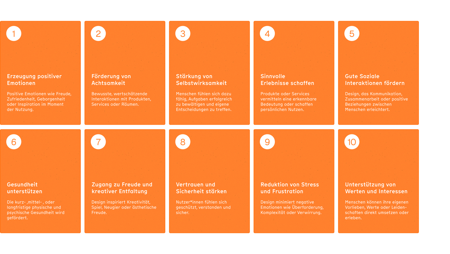 Die Arbeit formuliert zehn zentrale Ziele des Positiven Designs, die Gestalter*innen als Orientierung dienen. Sie helfen dabei, Ansatzpunkte für positive Gestaltung zu erkennen und gezielt weiterzuentwickeln. Die Ziele strukturieren mögliche Wirkungsfelder von Design, etwa die Förderung von Zufriedenheit, Sinn, sozialer Verbundenheit, Selbstwirksamkeit, emotionaler Stabilität oder langfristiger Lebensqualität. Sie dienen nicht als starre Vorgaben, sondern als Denk- und Handlungsrahmen für eigene Projekte.