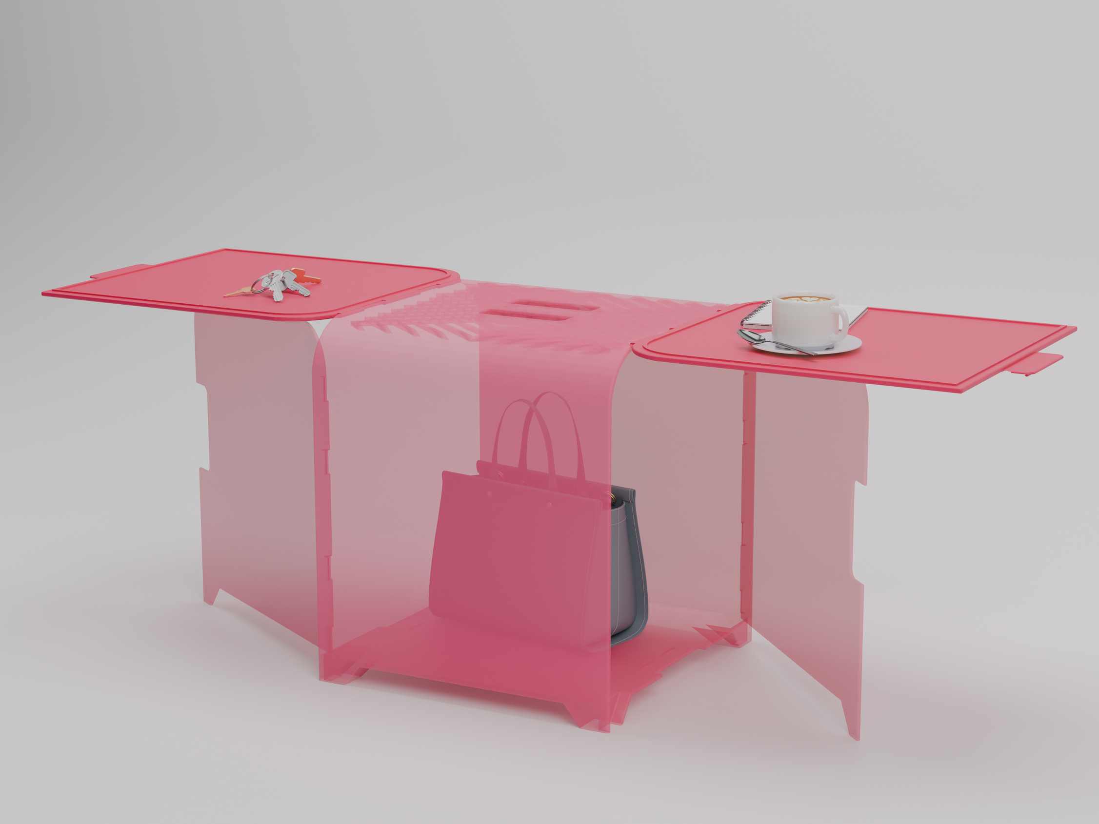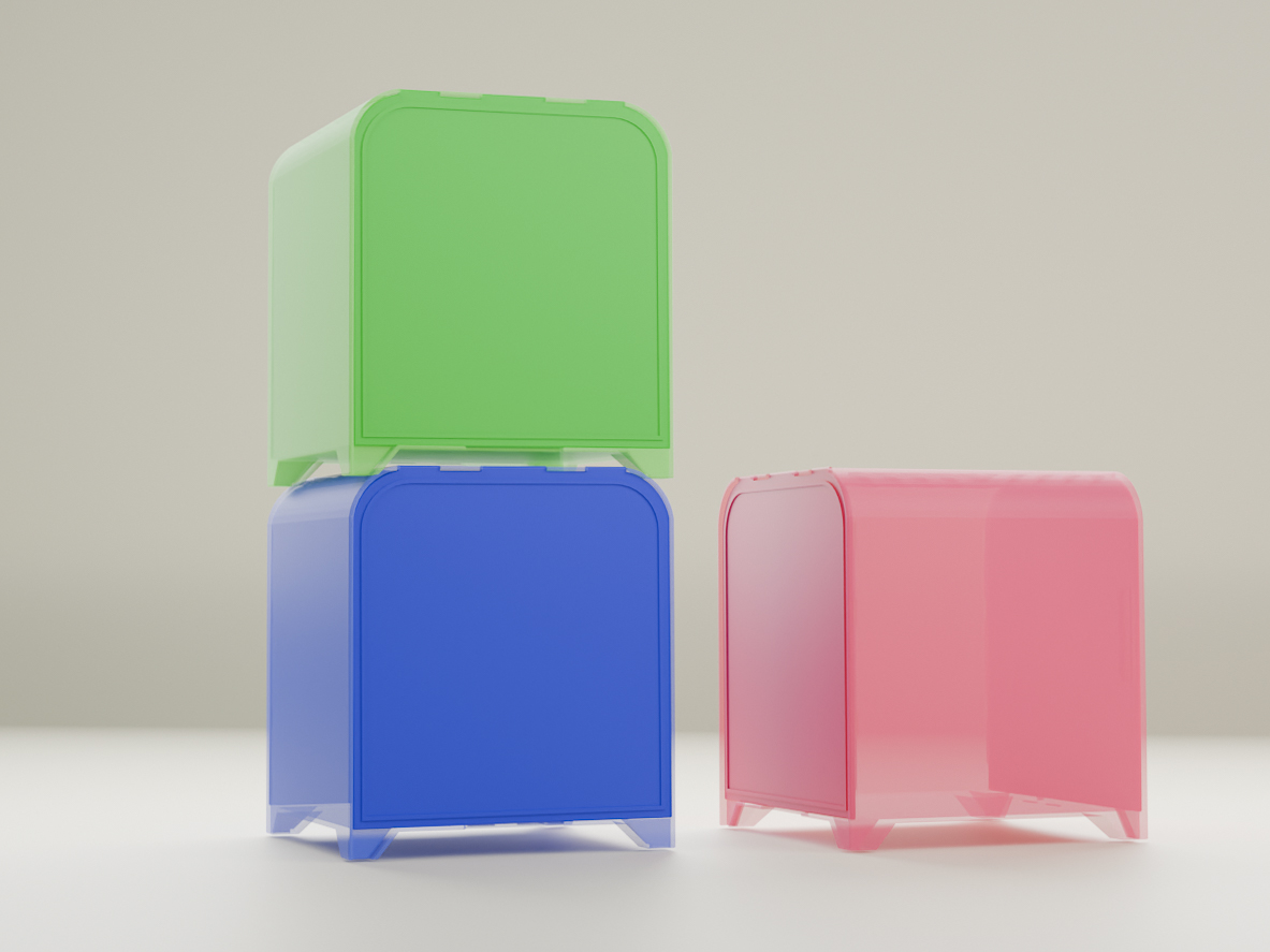 Die Farb und Materialwahl orientiert sich gezielt an der Formsprache klassischer Tupperware-Produkte. Dadurch entsteht eine vertraute, alltagstaugliche Ästhetik, die Funktionalität und spielerisches Design miteinander verbindet.