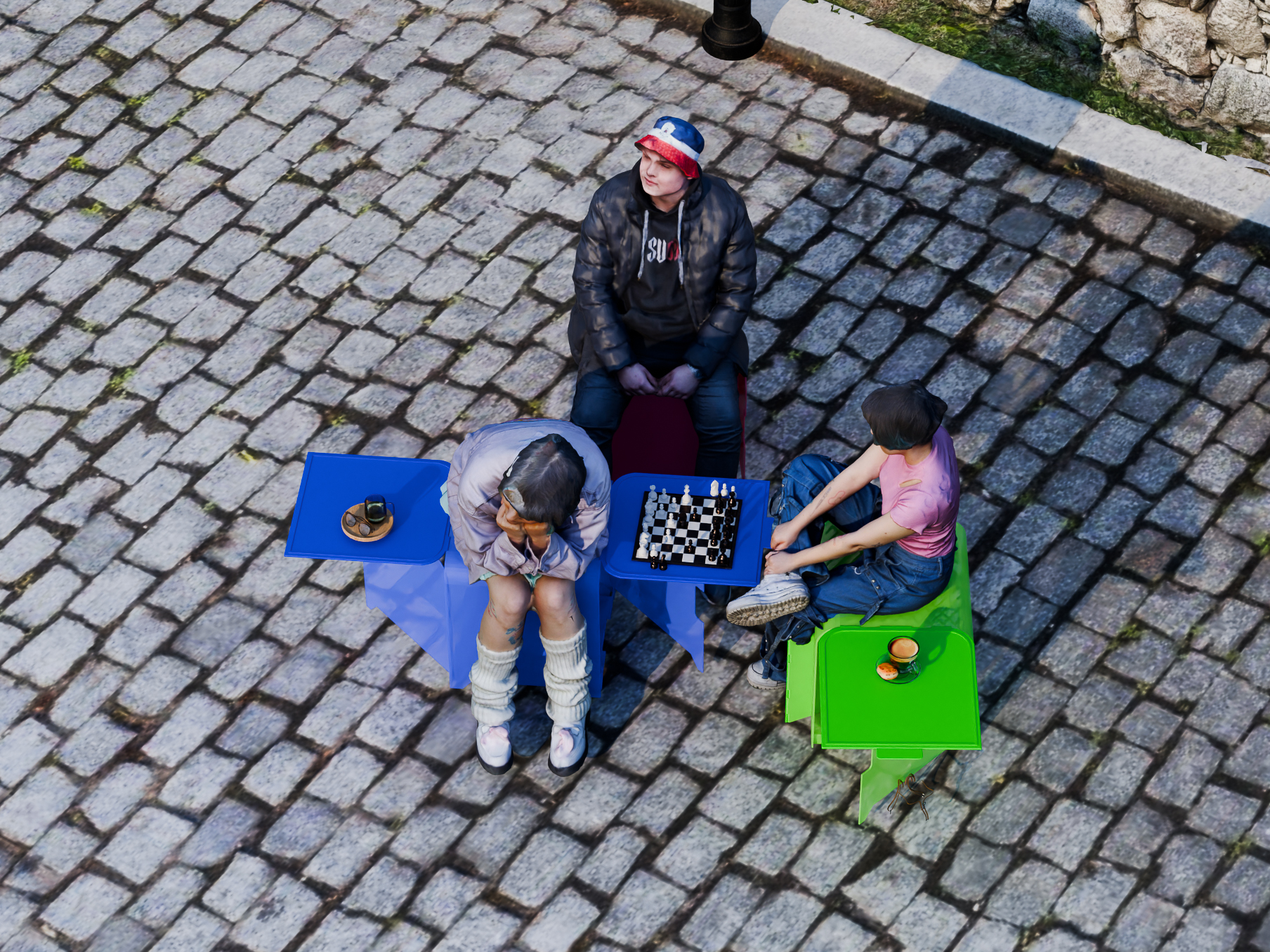 Der Sitzmeister ist in den drei Farben Grün, Blau und Magenta erhältlich. Der Hauptkörper sowie die Beine bestehen aus transluzentem Material. Die seitlichen Tische sind bewusst opak gestaltet, sodass auf den ersten Blick erkennbar ist, welche Flächen hoch und heruntergeklappt werden können.