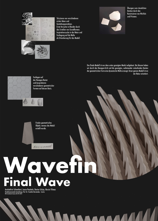Basierend auf einem dichten Hexagon-Raster entwickelten wir eine nach oben hin zulaufende Grundform, mit welcher sich unsere dynamische Veränderung gut visualisieren ließ. Gleichzeitig wohnt dieser Form die nötige Dramatik inne, die eine Monsterwelle mit sich bringt. Durch Längenveränderung und Drehung unseres geometrischen Grundobjekts erstellten wir ein Modul, mit welchem wir durch systematische Aneinanderreihung unser finales Modell aufbauen konnten, “Wavefin”.