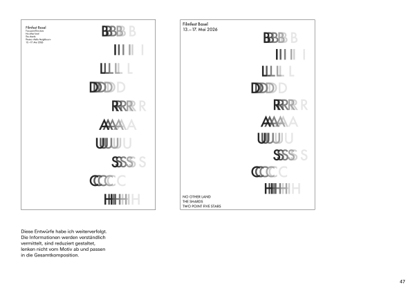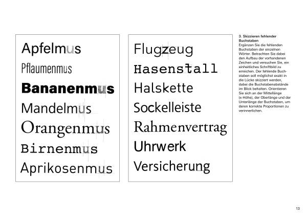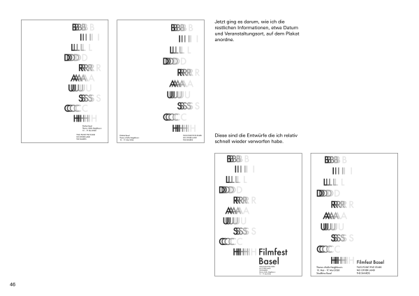 Die Dokumentation umfasst alle Arbeiten aus dem Typografie-Unterricht, von Hausaufgaben und Übungen im Unterricht über Präsentationen bis hin zum Endprojekt. Sie zeigt den gesamten Prozess von der Ideenfindung bis zur finalen Umsetzung.