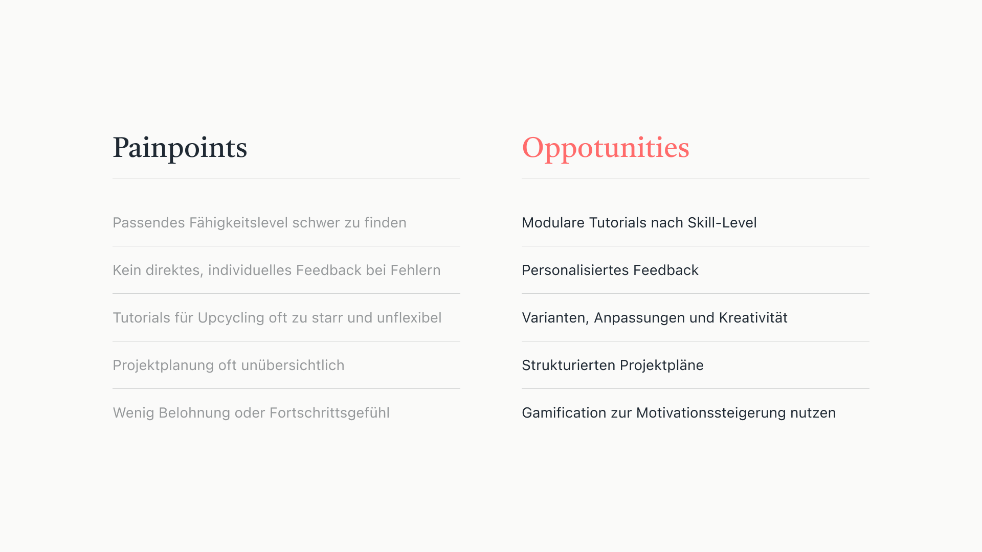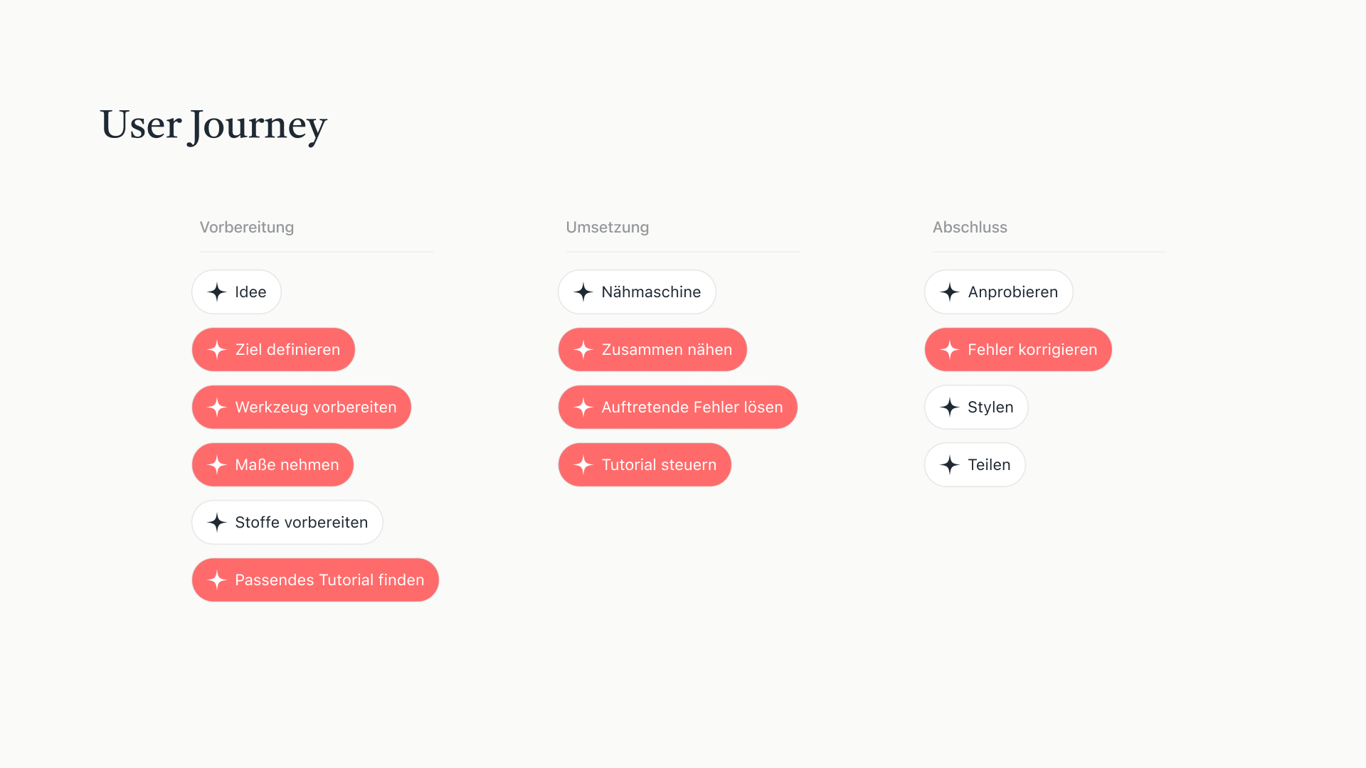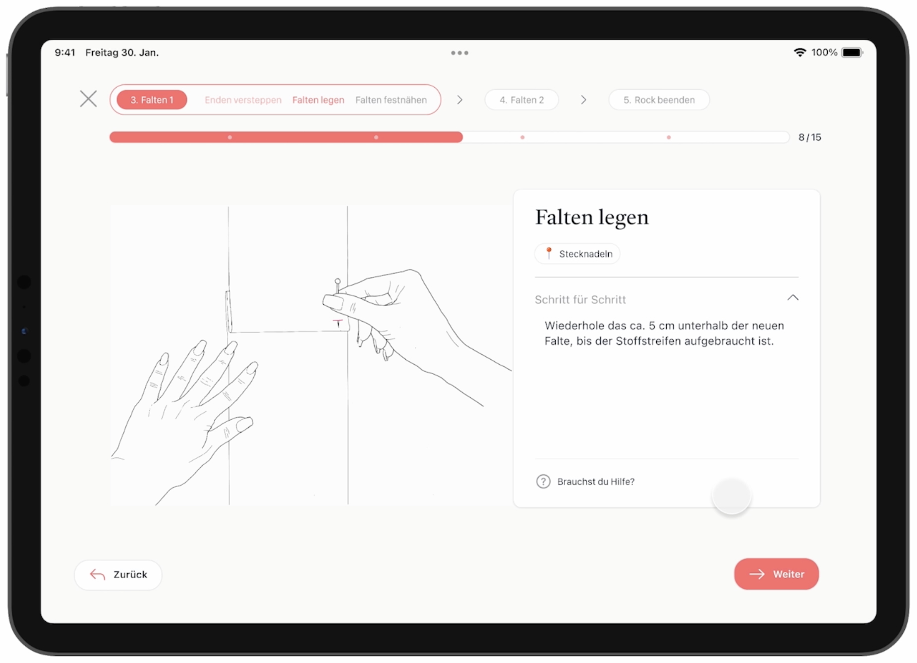 Viele Lernangebote zum Nähen sind unübersichtlich, zu komplex oder setzen Vorwissen voraus. Genau hier setzt das Projekt an. Die App begleitet Nutzer:innen Schritt für Schritt durch ein Nähprojekt: von der ersten Idee bis zum fertigen Kleidungsstück.
