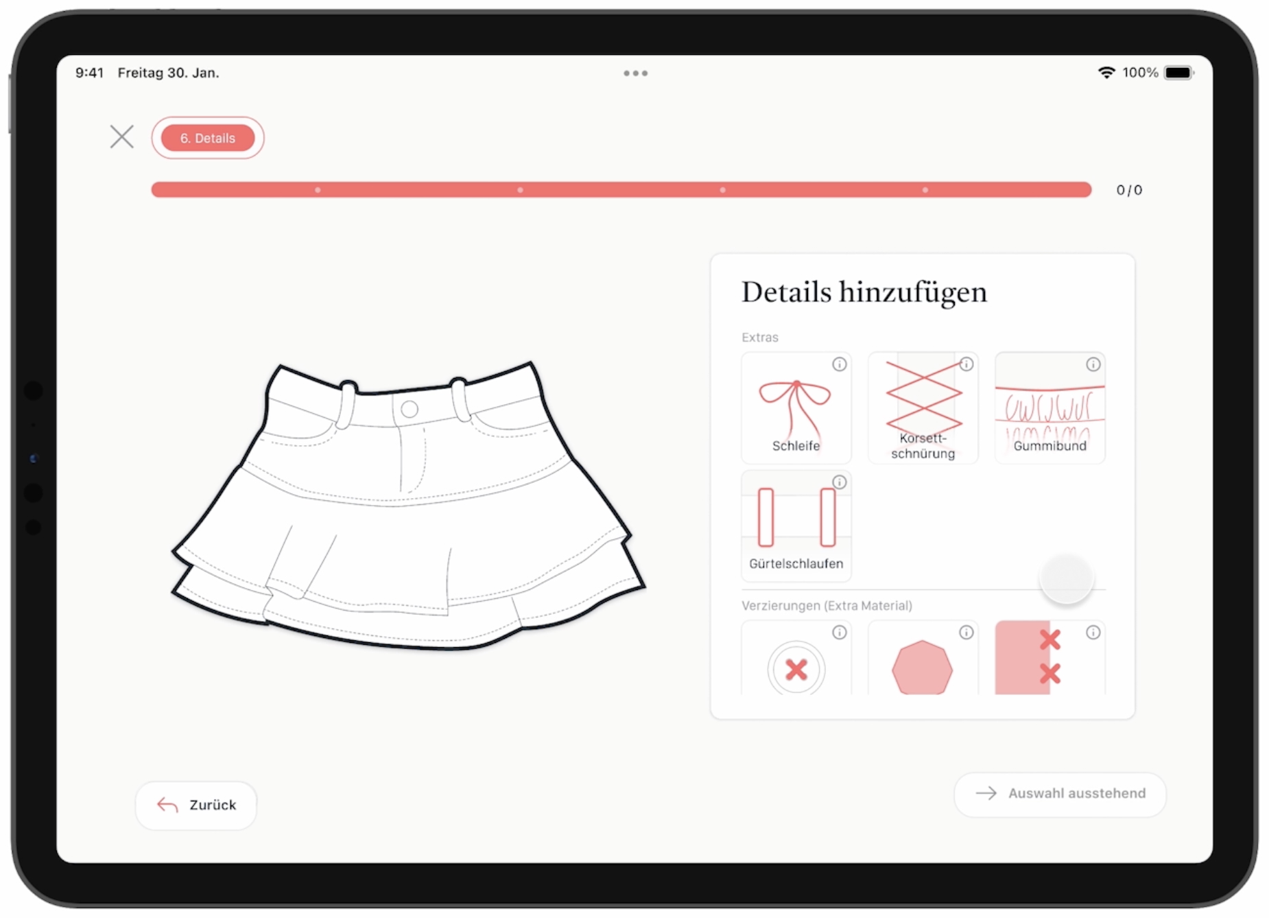 Nutzer:innen können den Ablauf flexibel anpassen, einzelne Schritte überspringen oder Details wie Saum, Falten oder Verzierungen selbst auswählen. So bleibt Raum für eigenes Ausprobieren und individuelle Gestaltung.
