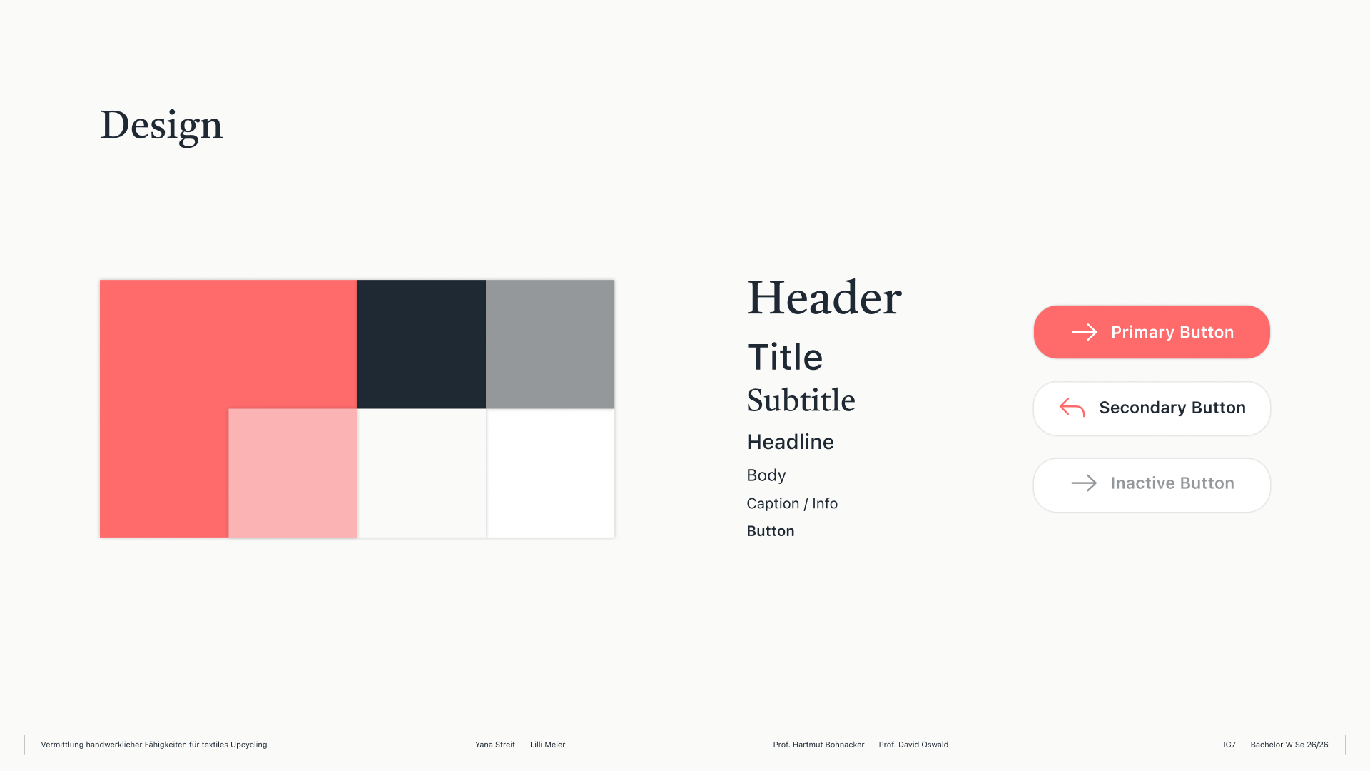 In unserem Bachelor-Projekt entwickelten wir eine interaktive Anwendung, die Menschen dabei unterstützt, Kleidung selbst zu reparieren, zu verändern oder neu zu gestalten. Anstatt neue Mode zu kaufen, lernen Nutzer:innen, vorhandene Kleidungsstücke kreativ weiterzuverwenden. Die Anwendung richtet sich an Menschen, die Lust auf Nähen und Gestalten haben, aber oft unsicher sind, wie sie ein Projekt planen oder umsetzen sollen.
