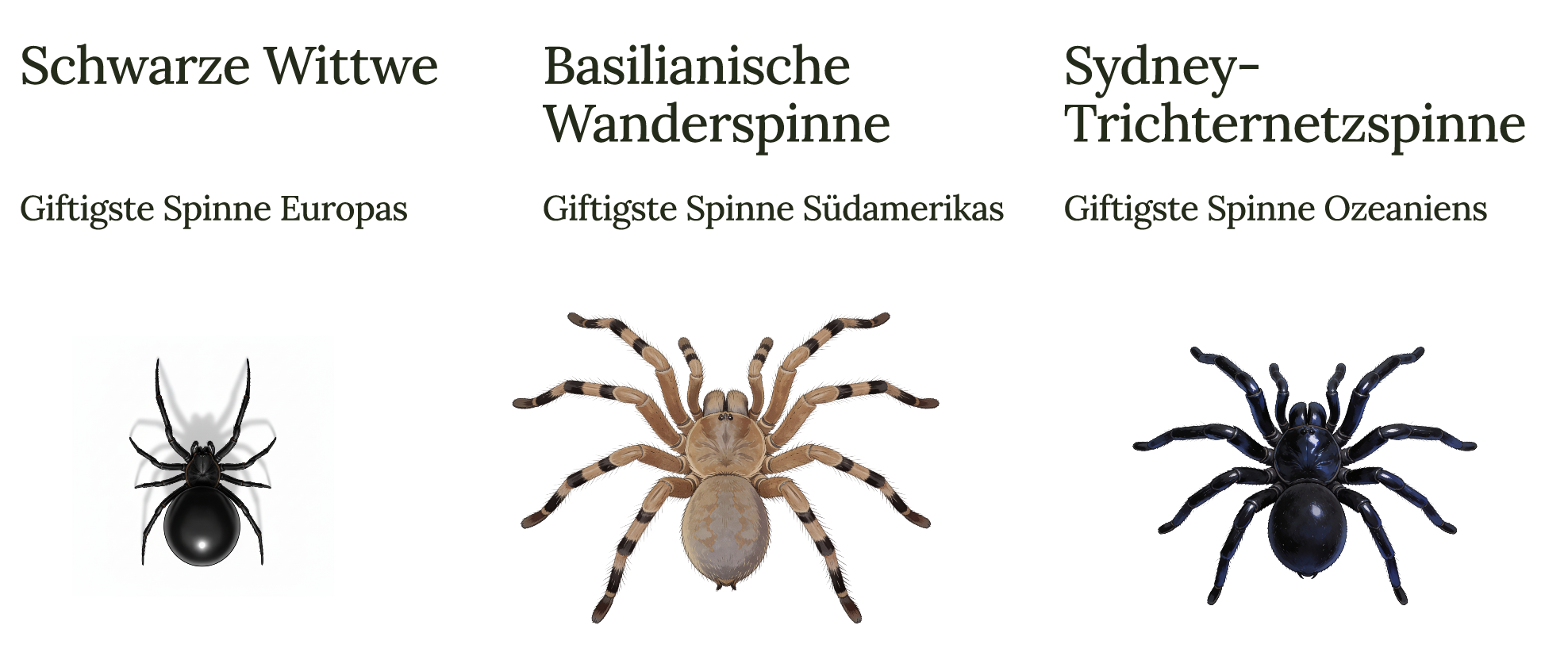Die Recherche konzentrierte sich auf drei Kontinente und jeweils die giftigste dort vorkommende Spinnenart: die Schwarze Witwe (Europa), die Brasilianische Wanderspinne (Südamerika) und die Sydney-Trichternetzspinne (Ozeanien). Diese Auswahl ermöglicht einen globalen Vergleich unterschiedlicher Giftmechanismen.