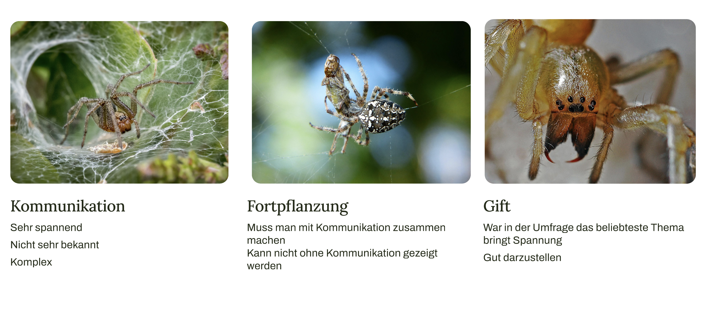 Aus dem übergeordneten Thema “Spinnen” kristallisierte sich durch Nutzerumfragen heraus, dass Spinnengift das größte Interesse weckt – deutlich mehr als Kommunikation oder Fortpflanzung. Diese Erkenntnis bildete die Grundlage für die inhaltliche Ausrichtung des Projekts.