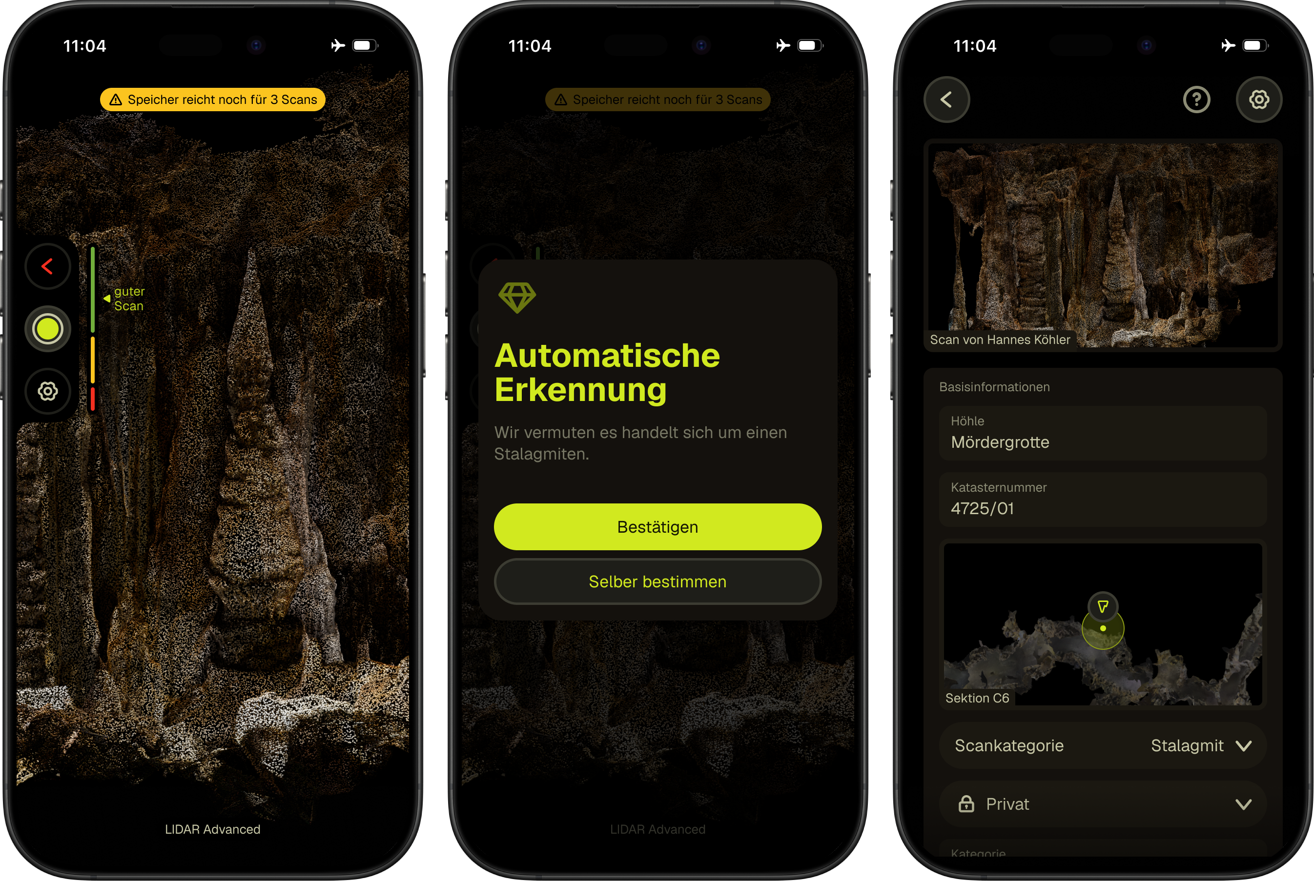 Der Schwerpunkt liegt auf der Scan Funktion. Hier wird, sofern verfügbar, das LiDAR des Handys oder alternativ Fotogrammetrie eingesetzt, um relevante Höhlenelemente digital zu erfassen. Die erzeugten Daten werden anschließend, wenn möglich, mithilfe eines Machine Learning Algorithmus klassifiziert und im nächsten Schritt präzise beschrieben und soweit möglich mit Trägheitsnavigation oder manuell in der Höhle verortet.