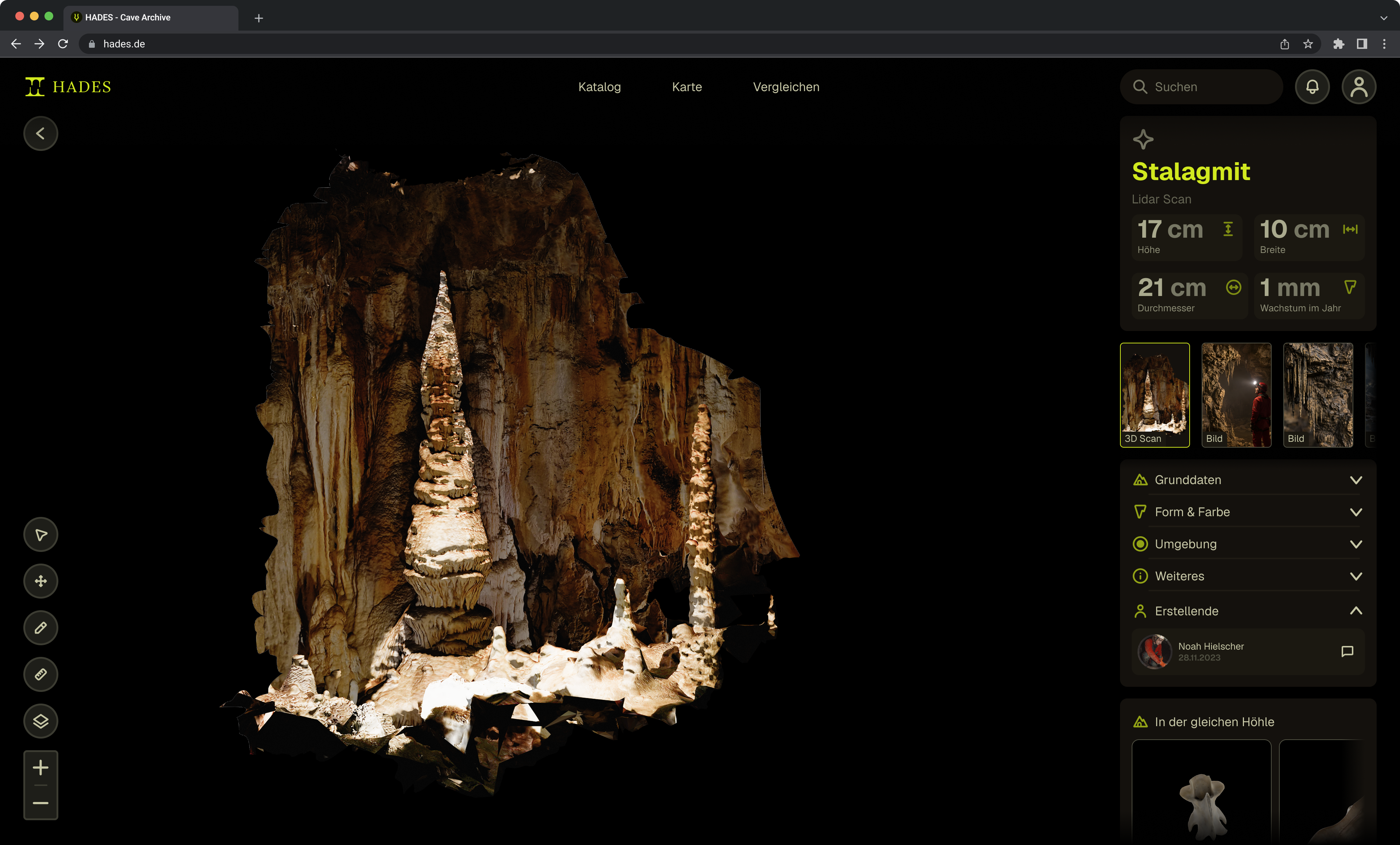 In der jeweiligen Höhle verortete Scans werden ebenfalls angezeigt und nach Möglichkeit auf der digitalen Höhlenkarte räumlich eingeordnet.