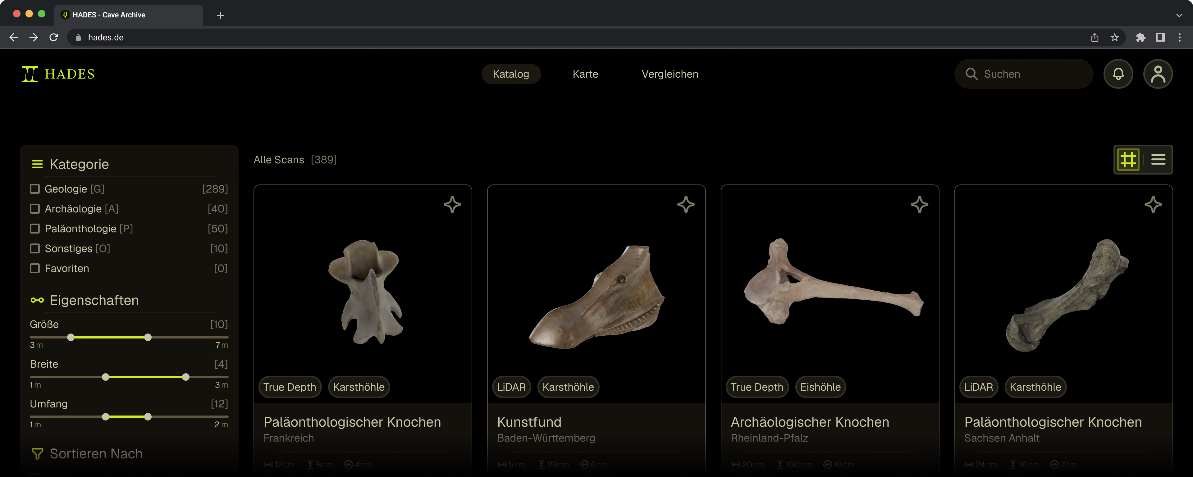 Die Detailansicht zeigt die in der HADES App gesammelten Metadaten in Kombination mit dem zugehörigen 3D Scan sowie, sofern vorhanden, ergänzenden Bildmaterialien. Der 3D Scan kann interaktiv betrachtet und bearbeitet werden. Zusätzlich besteht die Möglichkeit, die erfassende Person direkt über eine Nachrichtenfunktion zu kontaktieren.