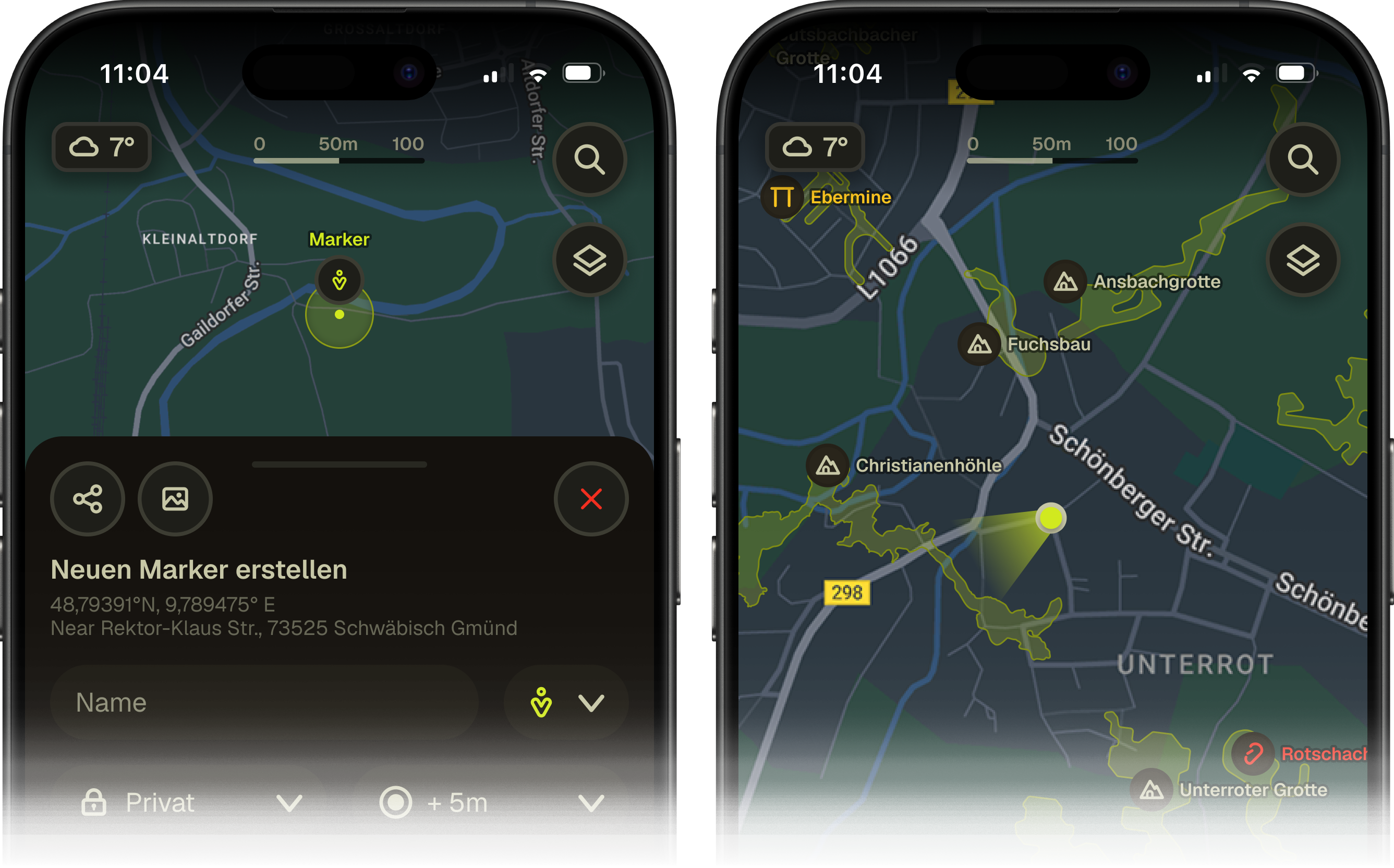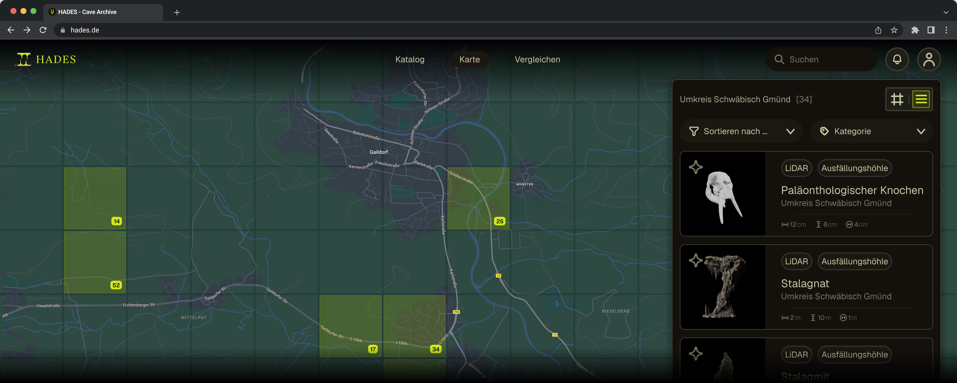 Hier werden verfügbare Höhlen nach Kategorien und mit Plan georeferenziert dargestellt. Diese können selbst angelegt oder von Vereinen und befreundeten Forschenden geteilt werden. Darüber hinaus lassen sich eigene Marker mit Radien setzen sowie unterschiedliche Kartenansichten nutzen, um die Suche nach neuen Höhlengebieten zu unterstützen.