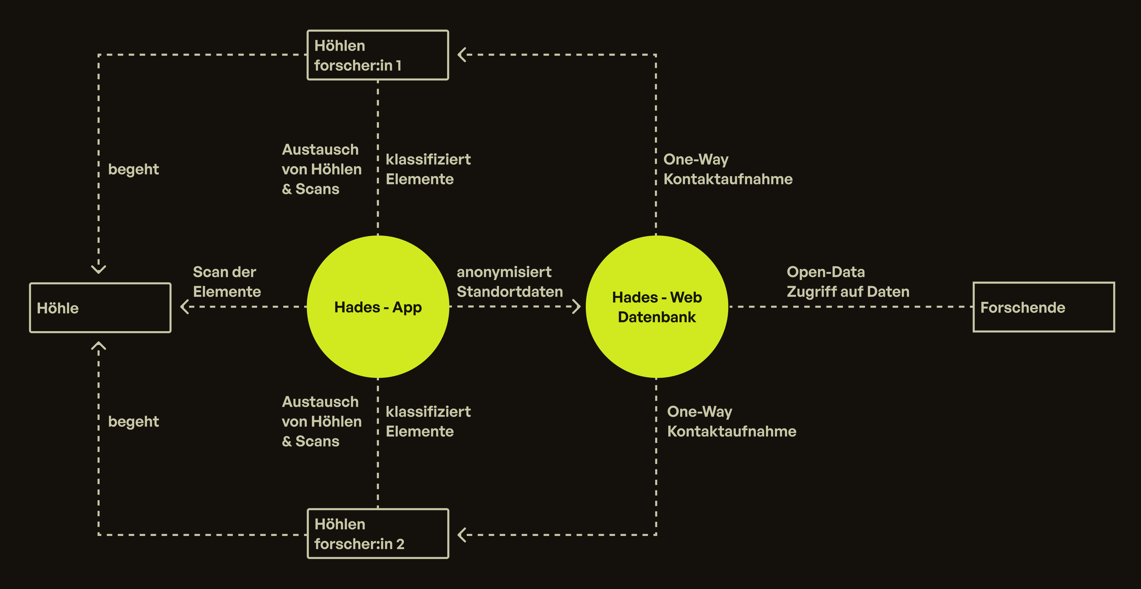 Das Projekt verbindet eine mobile App, die autorisierte Höhlenforscher:innen bei der systematischen 3D Erfassung und Archivierung unterirdischer Räume unterstützt, mit einer Website, die diese Daten für wissenschaftliche Zwecke anonymisiert zugänglich macht.