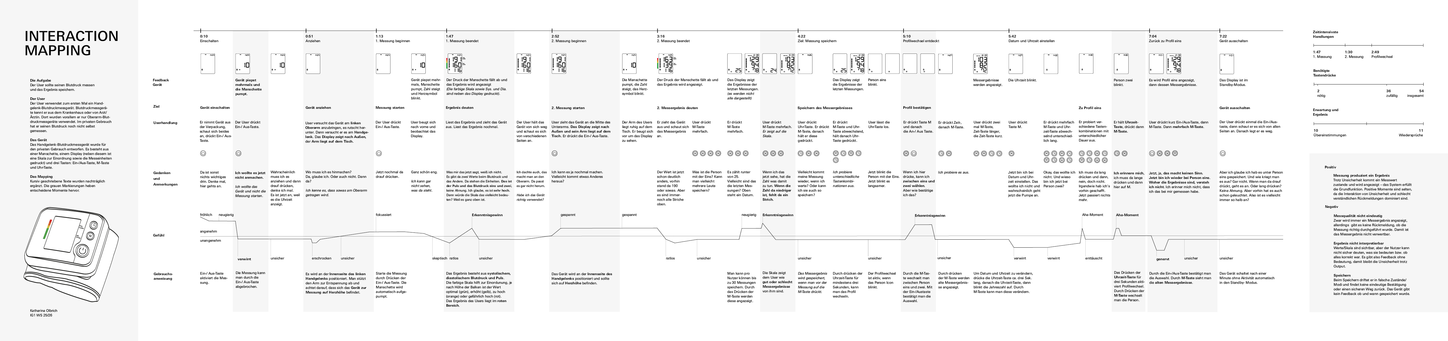 Im Rahmen des Mapping-Projekts wurde die Interaktion mit einem Handgelenk-Blutdruckmessgerät untersucht. Dafür wurde die Bedienung gefilmt und anschließend ausgewertet. Ziel war es, den gesamten Bedienprozess nachvollziehbar darzustellen und dabei entscheidende Momente – etwa Unsicherheiten oder typische Fehlerstellen – gezielt hervorzuheben. So entsteht eine visuelle Analyse, die zeigt, wie verständlich (oder missverständlich) das Gerät in der Anwendung ist und an welchen Stellen die Interaktion besonders relevant wird.