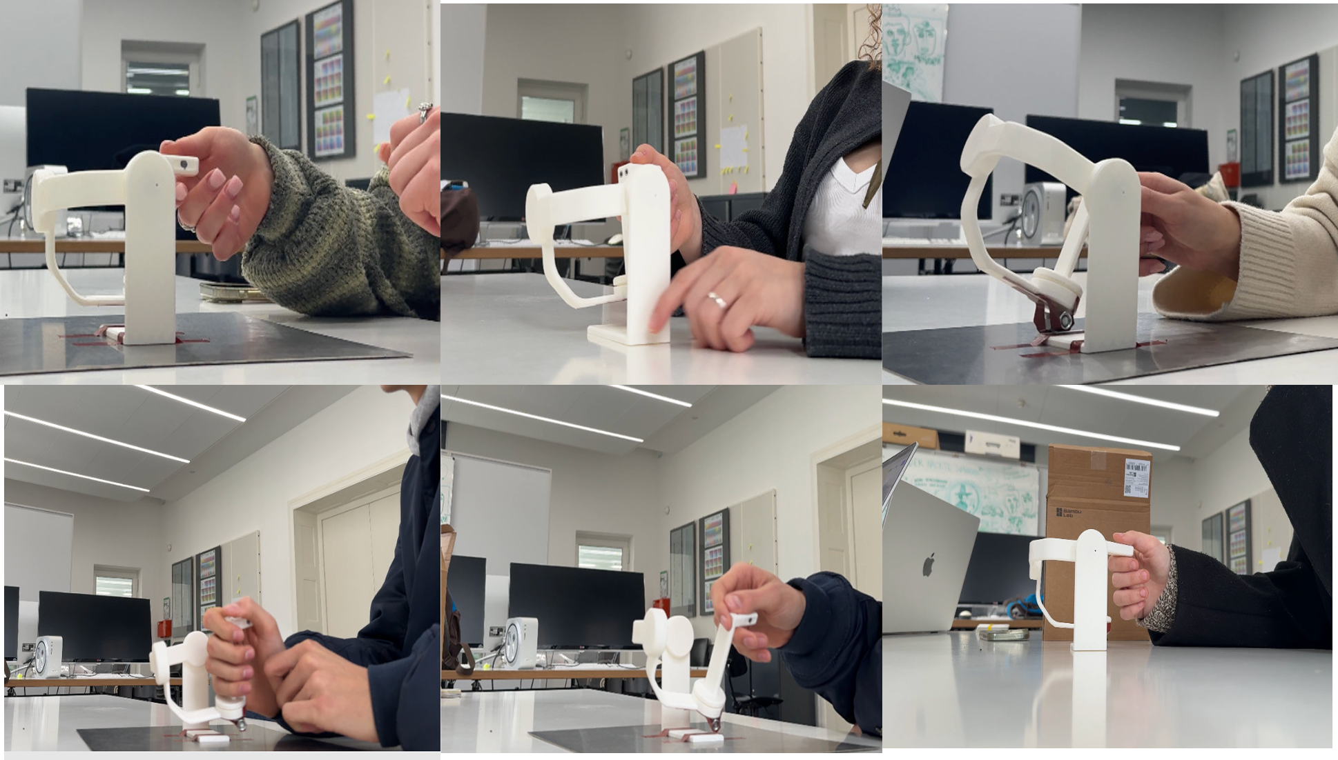 Um die Intuitivität unseres Konzepts zu überprüfen, führten wir mehrere User Tests durch. Dabei zeigte sich, dass die Zuordnung der Bewegungsachsen größtenteils gut verstanden wurde, das ursprüngliche Greifinterface jedoch nicht die gewünschte Klarheit bot.