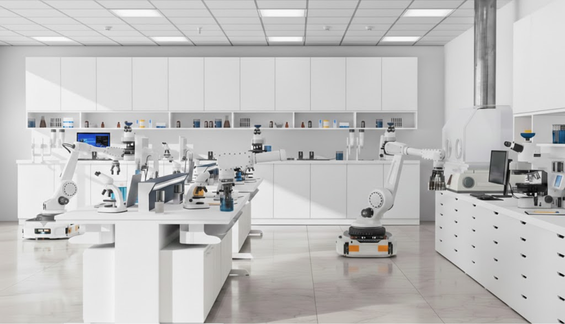Matte, helle Oberflächen und Edelstahl verweisen auf den Labor-Kontext, während gezielte orangefarbene Akzente die Interaktionselemente hervorheben.