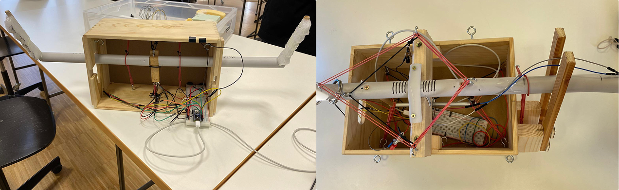 Der erste Prototyp nutzte eine kardanische, mit Gummibändern selbstzentrierende Aufhängung und Schiebepotentiometer zur Erfassung der Bewegungen. In der Praxis erzeugten jedoch Lagerung, Potis und Gummis zu viel Reibung, sodass sich eine große Lücke zwischen Konzept und realer Benutzbarkeit zeigte.