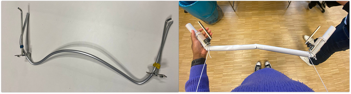 Modell 3 verfolgte daher einen anderen Ansatz: Die Steuerung des Greifarms wurde vollständig auf die Bewegung der Stange gemappt, sodass beide Daumen klar und einfach zugeordnet werden konnten. In der Recherche stellten wir fest, dass eine Stange mit zwei Händen sechs Freiheitsgrade ermöglicht – Vor/Zurück, Rechts/Links, Oben/Unten sowie horizontale Rotation, vertikale Rotation und Torsion –, die wir gezielt für unser Interface nutzbar machen wollten.