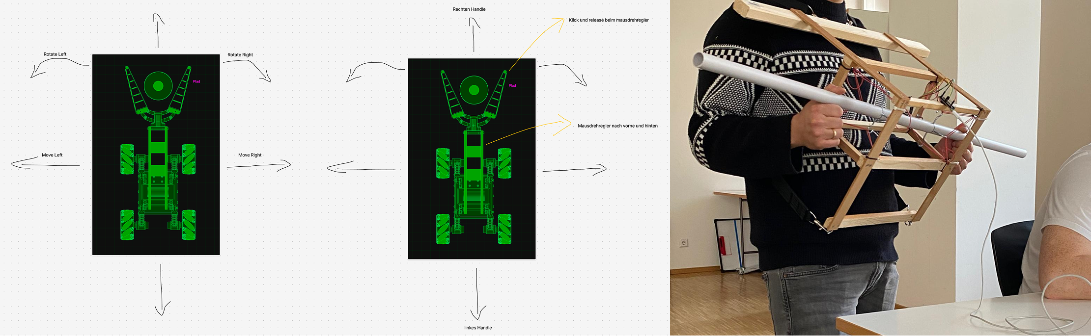Die zentralen Gestaltungskriterien unseres Interfaces waren Ergonomie, Multitasking und intuitive Bedienbarkeit. Die ergonomische Ausrichtung, symbolisiert durch die SZ-Stange als roter Faden, sollte eine freie Nutzung im Sitzen, Stehen oder Gehen ermöglichen. Gleichzeitig musste das System erlauben, Fahrzeug und Greifarm parallel zu steuern. Eine klare Affordanz war entscheidend, damit die Bedienung schnell verständlich ist. Wir entschieden uns früh für eine beidhändige Steuerung, da sie bessere Kontrolle und leichteres Multitasking bietet. Zudem legten wir Wert auf hohe Responsiveness mit stufenlosen Einstellungen, sofortigem Feedback und einer Return-to-Center-Funktion.