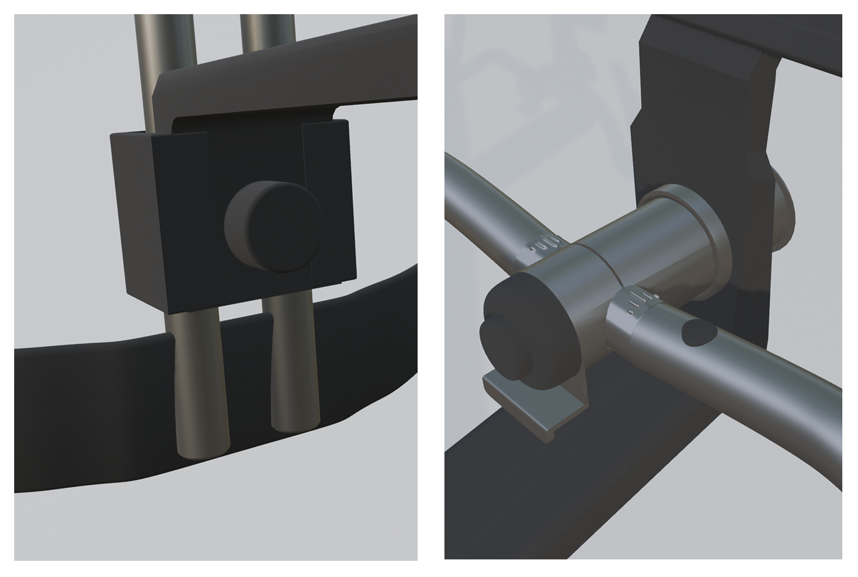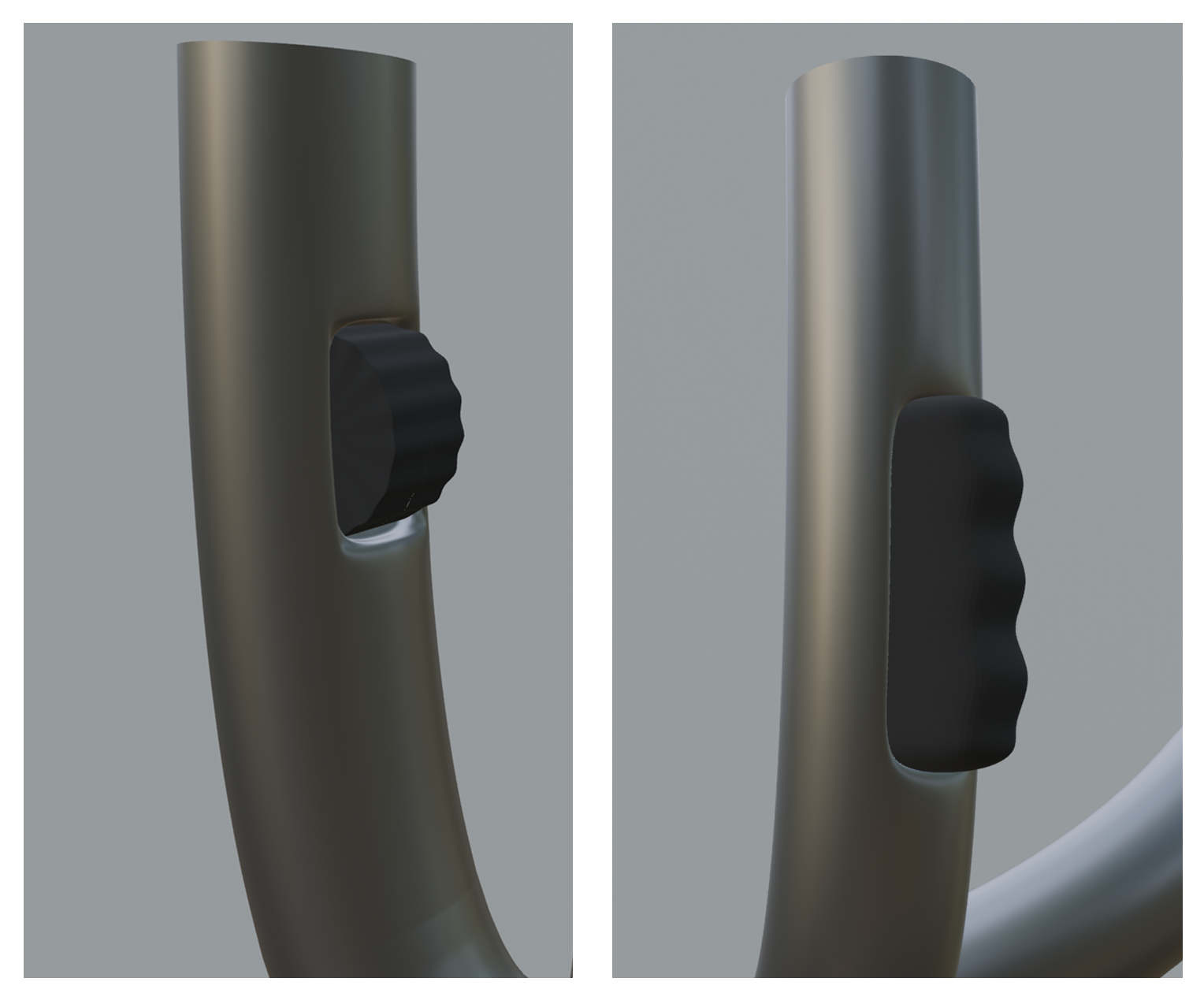 Die Lenkstange nutzt ein kulturell vertrautes Steuerkonzept: Der Zylinder signalisiert durch seine Form die Drehbewegung, die Richtung ist intuitiv erfassbar. Die Tiefenverstellung erfolgt über einen Druckknopf mit Griffplatte, die Skala auf der Stange dient als Signifier für die Torsionsfunktion. Der An-/Aus-Knopf ist bewusst außerhalb des Lenkbereichs platziert.