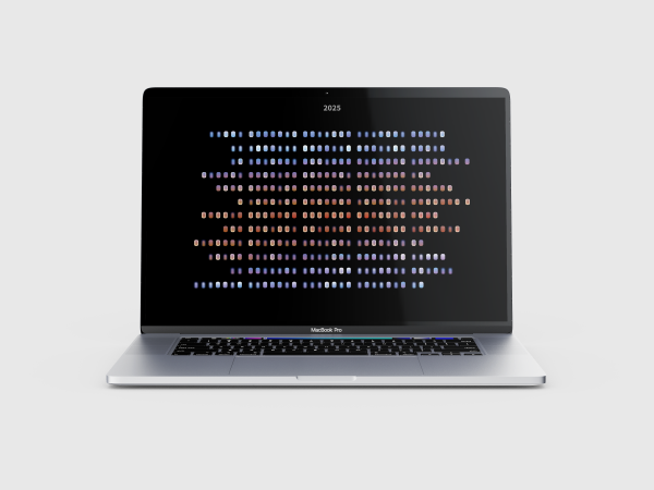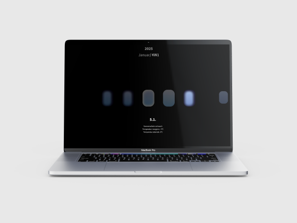 Die Farbskala reicht von warmen Rottönen (heiße Tage) zu kühlen Blautönen (kalte Tage). Ergänzend variiert die Helligkeit, um die Intensität der Sonne darzustellen: von gedimmt an schwachen Tagen bis hin zu schimmernd an besonders sonnigen Tagen. Durch die leichte Verschiebung durch den unterschiedlichen Beginn der Wochentage jedes Monats entsteht zudem ein Rhythmus, der die Wochentage sichtbar macht und dem Kalender eine dynamische Struktur verleiht.