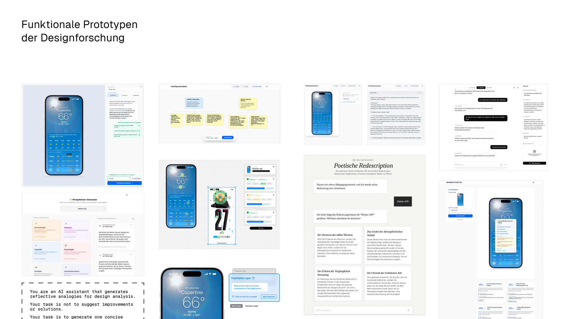 Diese Masterarbeit untersucht daher, wie KI im Design nicht nur zur Effizienzsteigerung eingesetzt werden kann, sondern gezielt zur Unterstützung von Reflexion, Interpretation und Bedeutungsentwicklung im Entwurfsprozess. So soll eine Perspektive auf die Mensch-KI-Interaktion erforscht werden, in der neue kognitive Bedürfnisse mit technischen Chancen vereint werden.