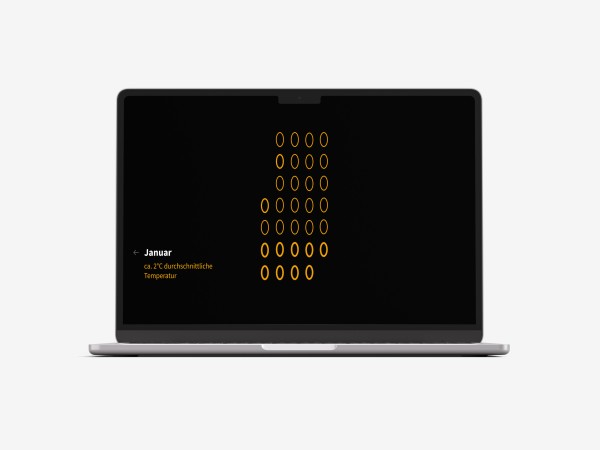 Ich begann damit einen statischen Kalender zu entwickeln, der durch seine From die Tageslichtdauer im Jahr 2026 veranschaulicht und durch den Farbverlauf die Temperaturentwicklung. Die interaktive Gestaltung dient dazu, den statischen Kalender erfahrbar zu machen und eine verbale Informationsebene zu ergänzen.