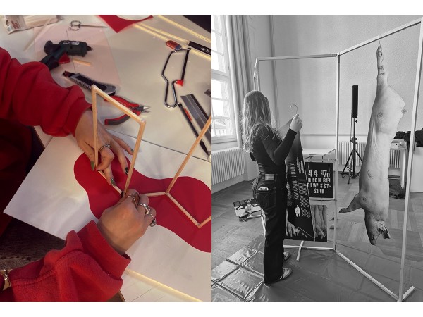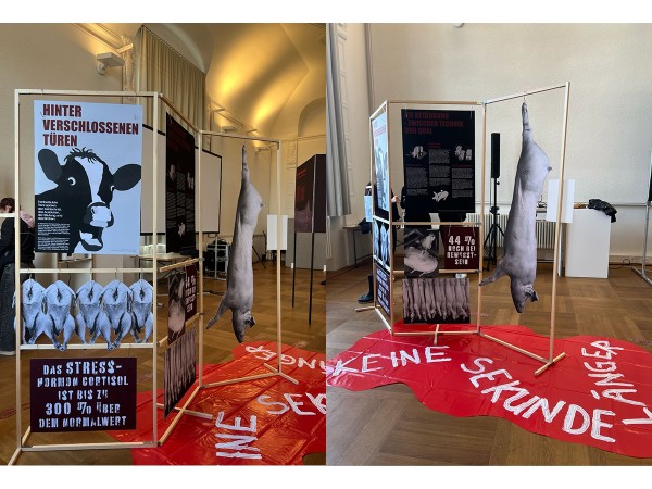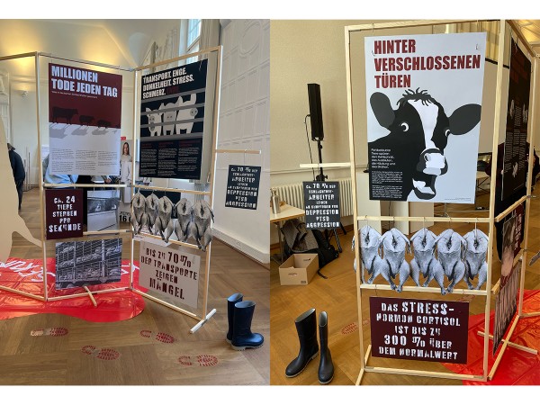 In unserem Projekt, in den Fächern Ausstellungsgestaltung und Medientechnologie, haben wir eine Protestausstellung zum Thema Leid im Schlachthof entwickelt. Unsere Installation bestand aus mehreren Ausstellungselementen, die zur Auseinandersetzung mit Tierhaltung und Fleischproduktion anregen sollten. Das Hauptexponat war ein lebensgroßes Schwein, das gleichzeitig als Projektionsfläche für unseren Medienteil diente. Durch die Kombination aus Objekt, Raum und Projektion wollten wir eine direkte und emotionale Wirkung erzeugen und das Thema für Besucherinnen und Besucher erfahrbar machen.