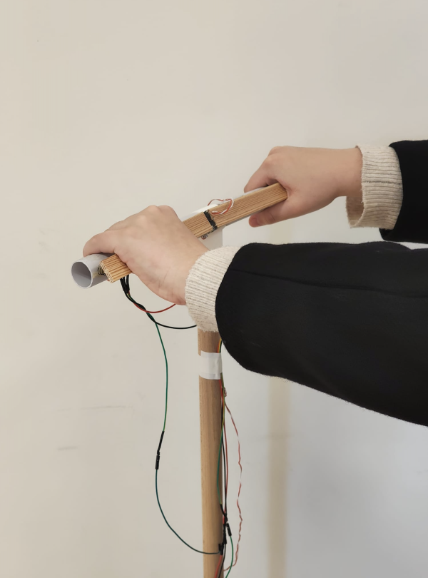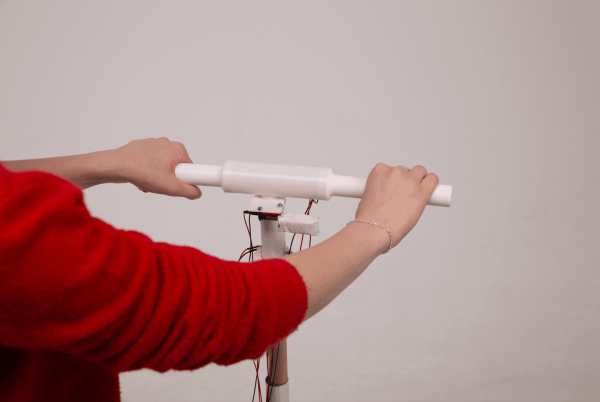 Die Bewegungen für Rotation und das Greifarm aus- und einfahren wird über Buttons ausgelöst, die durch kleine Vorsprünge im Griff gedrückt werden. Bei der Drehung drückt der Vorsprung gegen die einzelnen Buttons. Bei der Drehung des Lenkers bringen Federn den Griff nach der Bewegung automatisch in die Mittelposition zurück, wodurch ein klarer Nullpunkt entsteht.