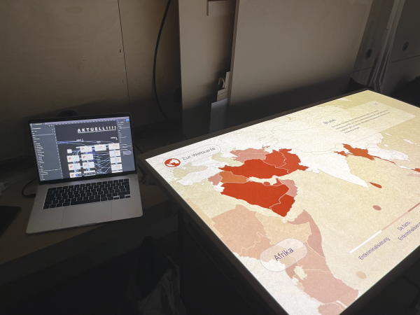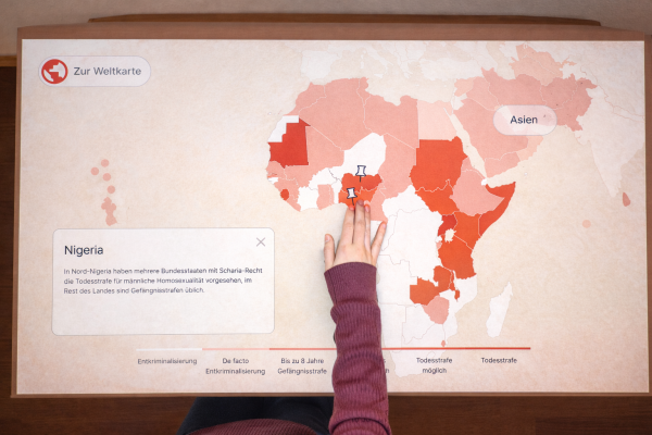 Ergänzt wird die Installation durch einen interaktiven Medientisch mit projizierter Weltkarte. Per Touch können Länder ausgewählt und zusätzliche Informationen zu den jeweiligen gesetzlichen Grundlagen abgerufen werden. So verbindet die Arbeit räumliche Konfrontation mit inhaltlicher Vertiefung und versteht sich als stiller Protest für Menschenrechte und Gleichberechtigung.