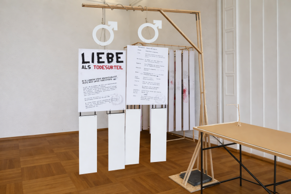 Im Rahmen der Kurse Ausstellungsgestaltung und Medientechnologie haben wir eine Protestinstallation zum Thema „Liebe als Todesurteil“ entwickelt. Sie thematisiert die Tatsache, dass in mehreren Ländern weltweit noch immer die Todesstrafe für Homosexualität verhängt wird.