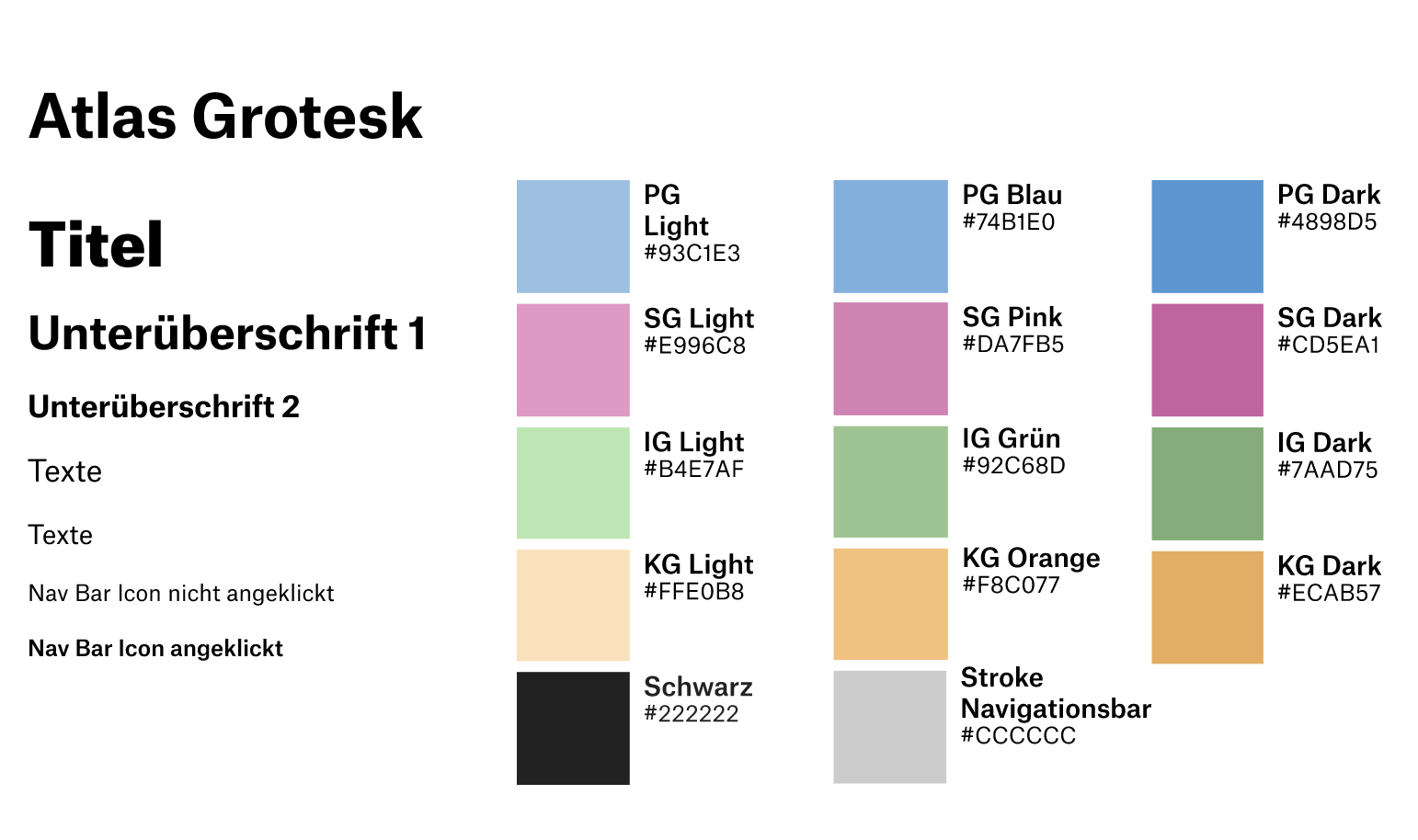 Bei der Typografie entschieden wir uns für die Schriftart Atlas Grotesk, da sie die Hausschrift der HfG ist. Für die Farbgestaltung orientierten wir uns zunächst an den bereits bestehenden, pro Studiengang definierten Farben. Diese erwiesen sich jedoch als gestalterisch zu eingeschränkt, weshalb wir sie überarbeiteten und weiterentwickelten, um sie flexibler und vielseitiger einsetzen zu können.