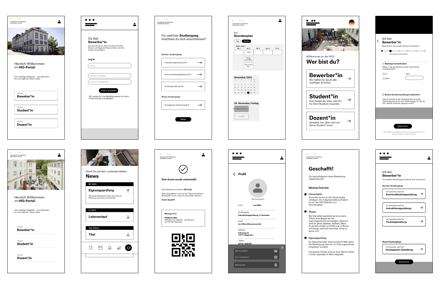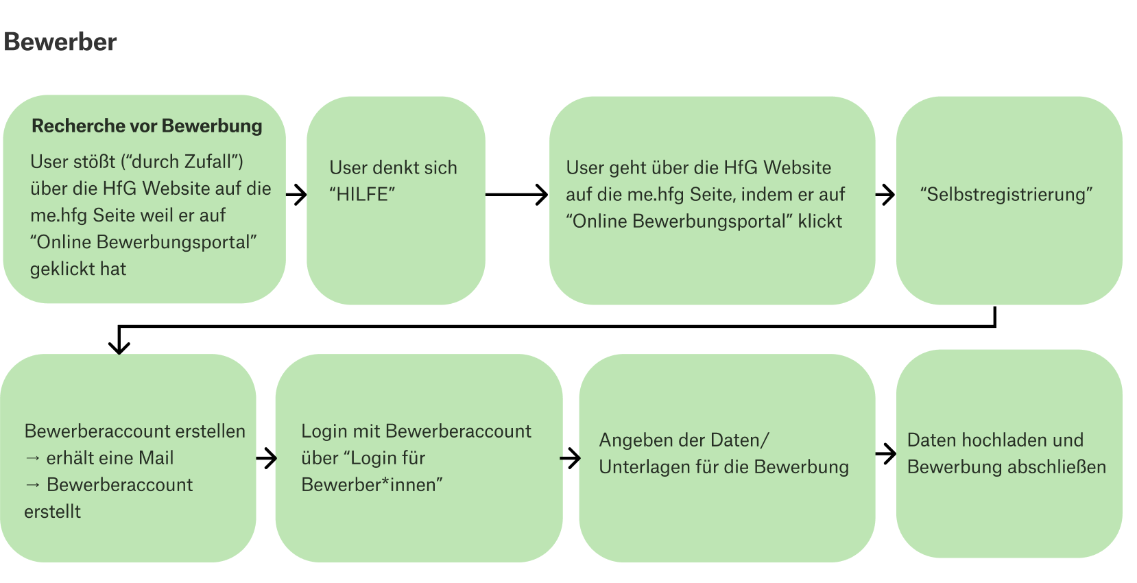 Um die genaue Customer Journey einzelner Nutzender besser nachvollziehen zu können, beschäftigten wir uns intensiv mit den jeweiligen Touchpoints. Dabei fokussierten wir uns auf zwei zentrale Perspektiven: die eines Bewerbers sowie die eines Studierenden.
