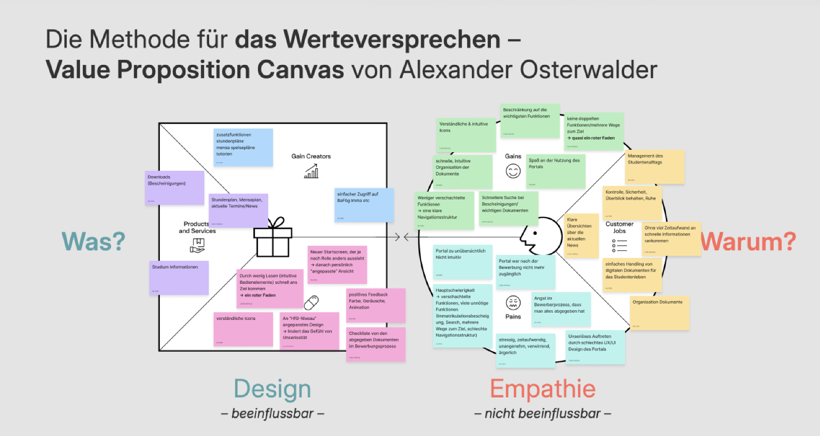 Die Definition der Nutzendengruppe sowie das erarbeitete Werteversprechen werden im Semesterverlauf mit wachsenden Erkenntnissen stetig und iterativ angepasst.