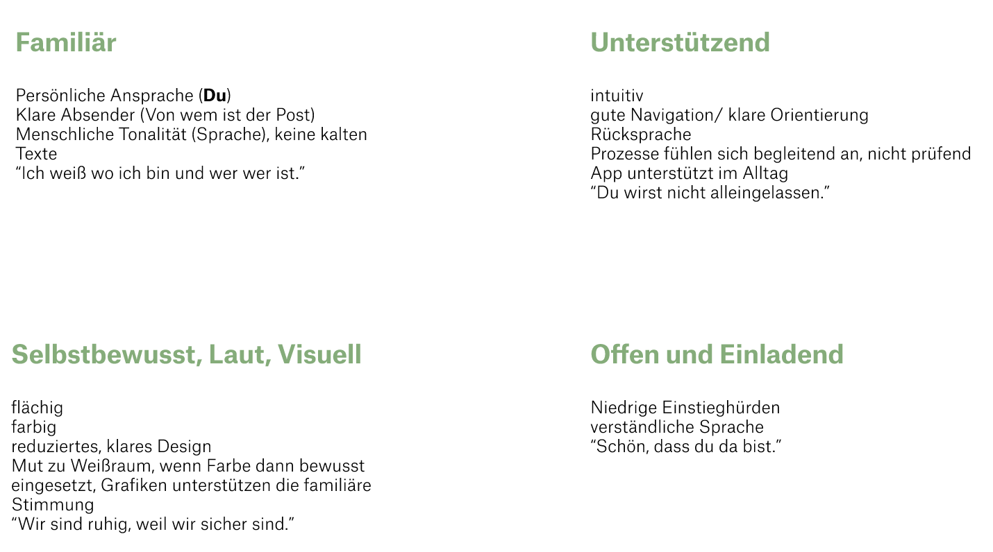 Daraus entstanden mehrere übergeordnete Überschriften, die später sowohl das Design als auch den strukturellen Aufbau der App definierten und als gestalterische Leitlinien dienten.