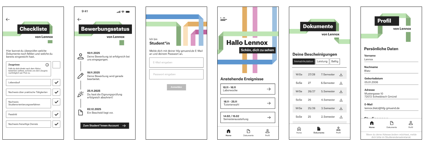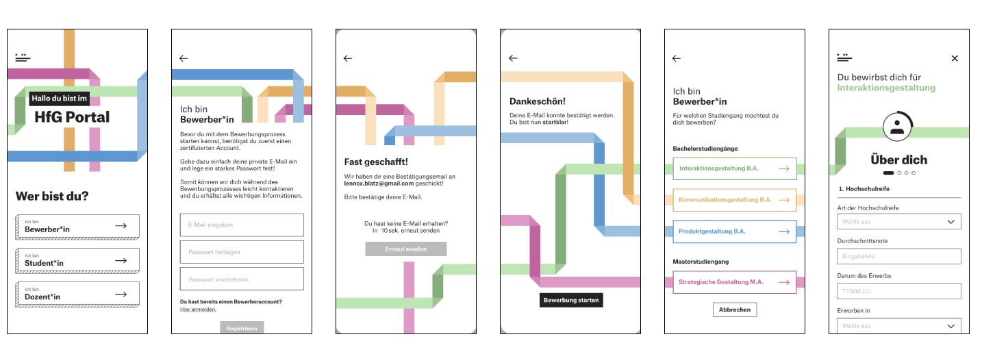 Die Linie des jeweils ausgewählten Studiengangs zog sich beispielsweise durch den gesamten Bewerbungsprozess und fand sich später im Studierenden-Home gemeinsam mit den Linien der anderen Studiengänge wieder. Somit kann man mithilfe des integrierten Swipe Pattern einen sichtbaren Verlauf erkennen.