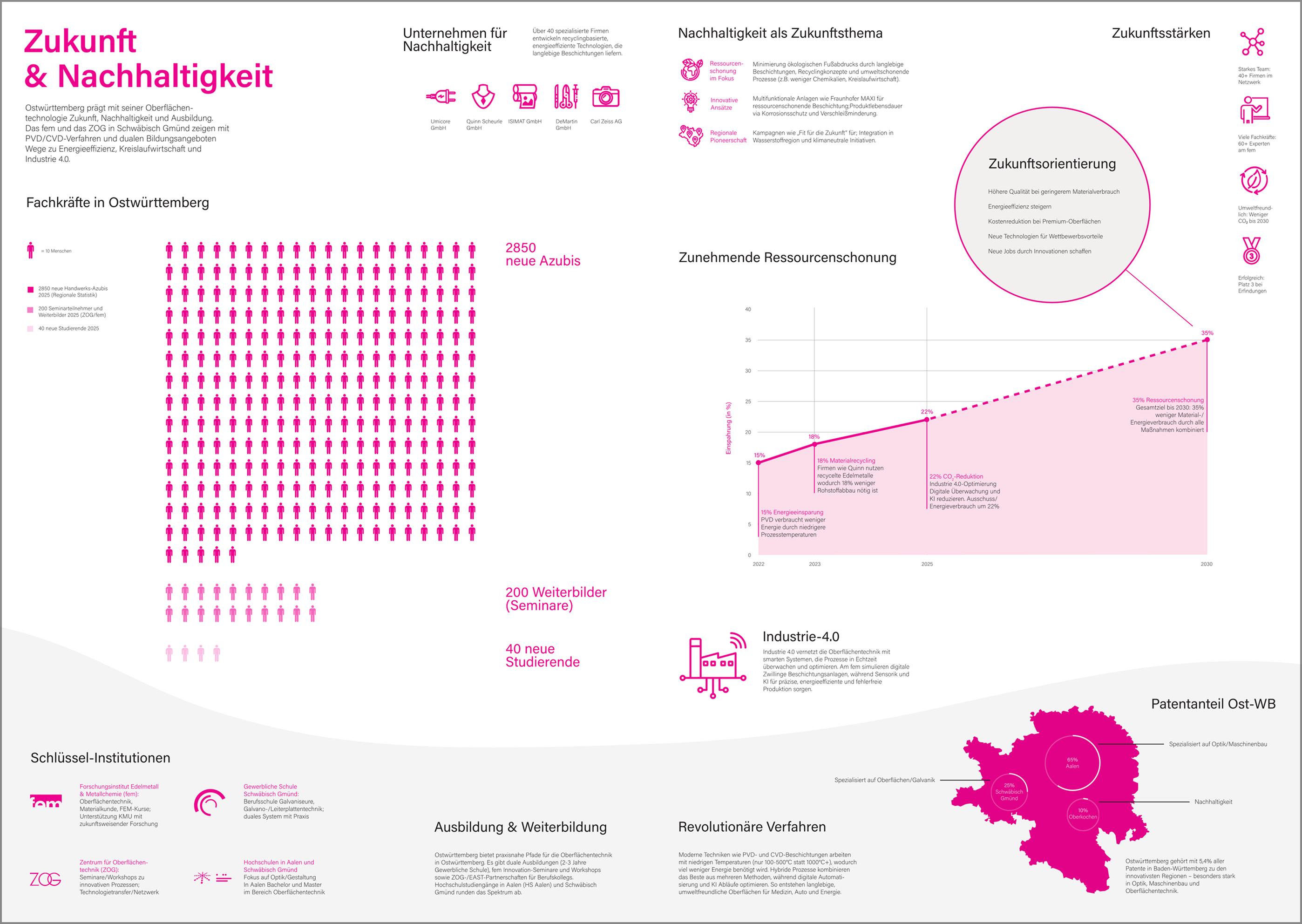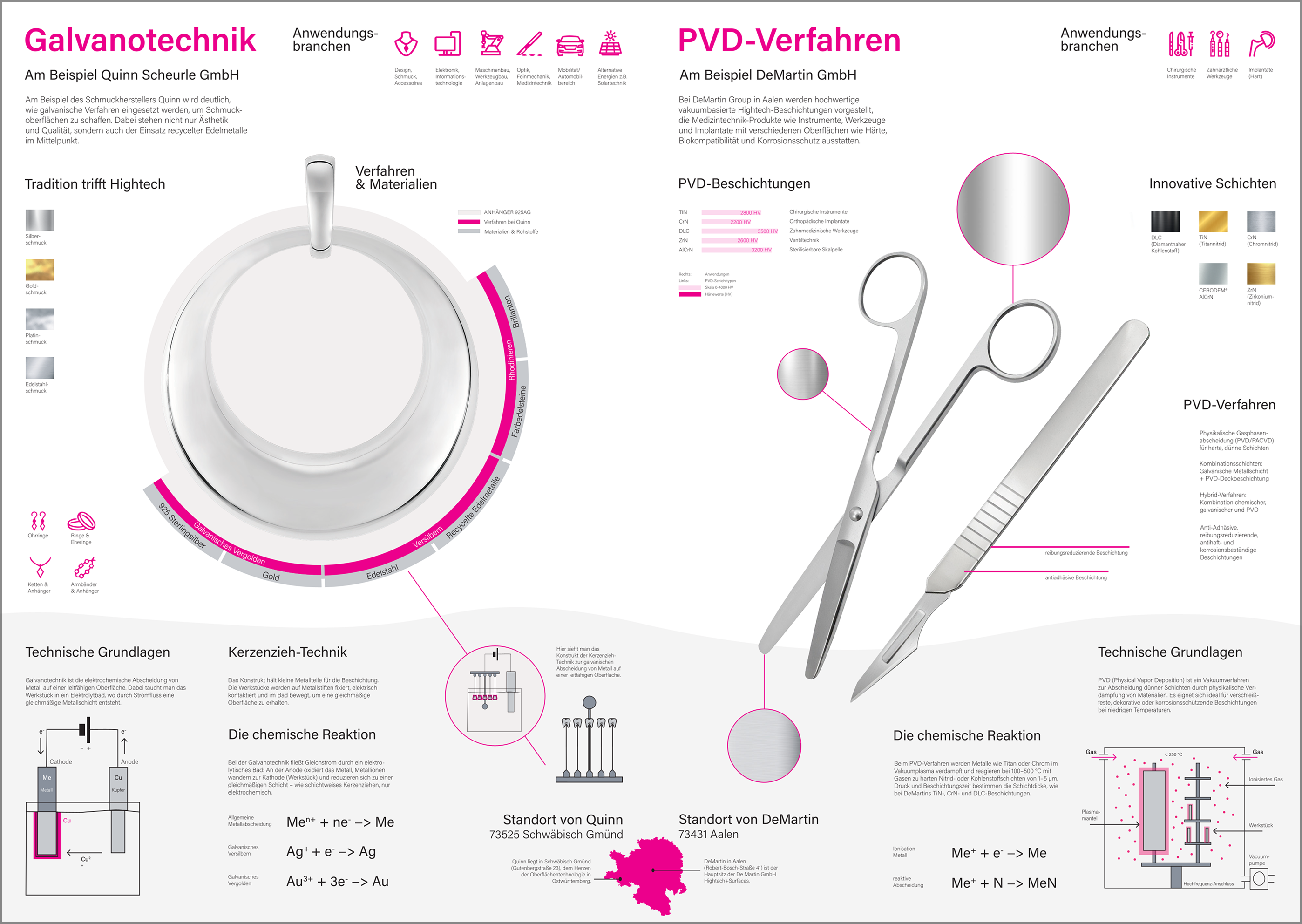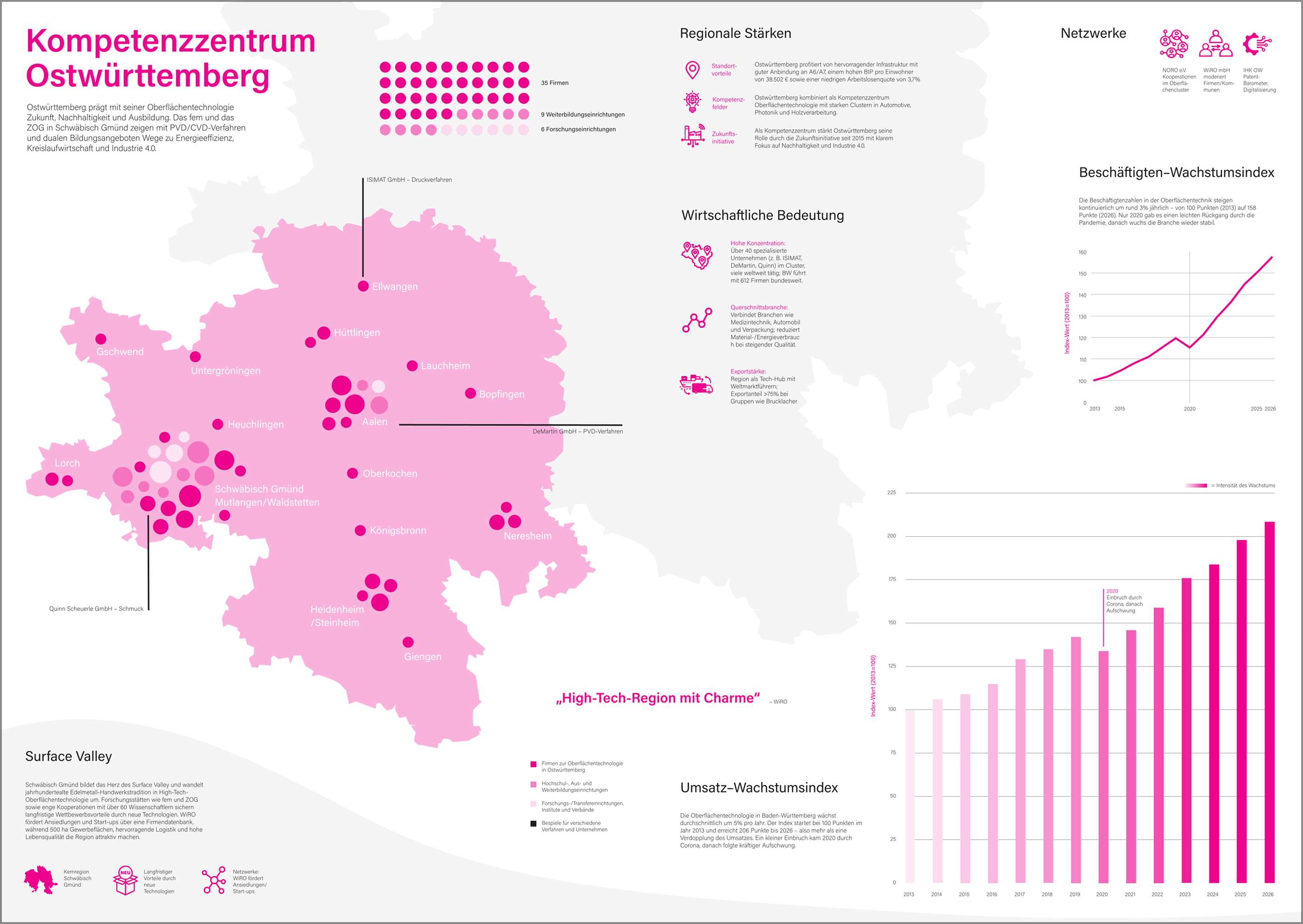 Im Rahmen des Projekts „Innovationslandschaft Ostwürttemberg“ haben wir in Kooperation mit der WiRO Wirtschaftsförderungsgesellschaft Region Ostwürttemberg unter dem Titel „Oberflächentechnologie“ eine Arbeit entwickelt, die regionale Tradition mit technologischer Zukunft verknüpft. Im Mittelpunkt stehen Handwerk, Surface Valley und verschiedene Verfahrenstechniken. Sie alle haben einen Bezug zur Oberflächentechnologie – von den handwerklichen Wurzeln der 1950er Jahre in Schwäbisch Gmünd bis zu den Hightech-Anwendungen heute. Unsere Herangehensweise war geprägt durch Präzision: mit intensive Recherche und eine konzeptionelle Aufarbeitung wollten wir nicht nur informieren, sondern das Kompetenzzentrum Ostwürttemberg im Bereich Oberflächentechnologie begreiflich machen. Unser Projekt ist deshalb eine Einladung, die Oberflächentechnologie zu entdecken und zu verstehen.