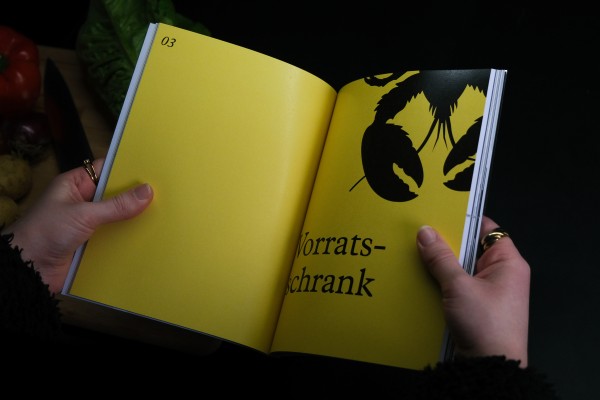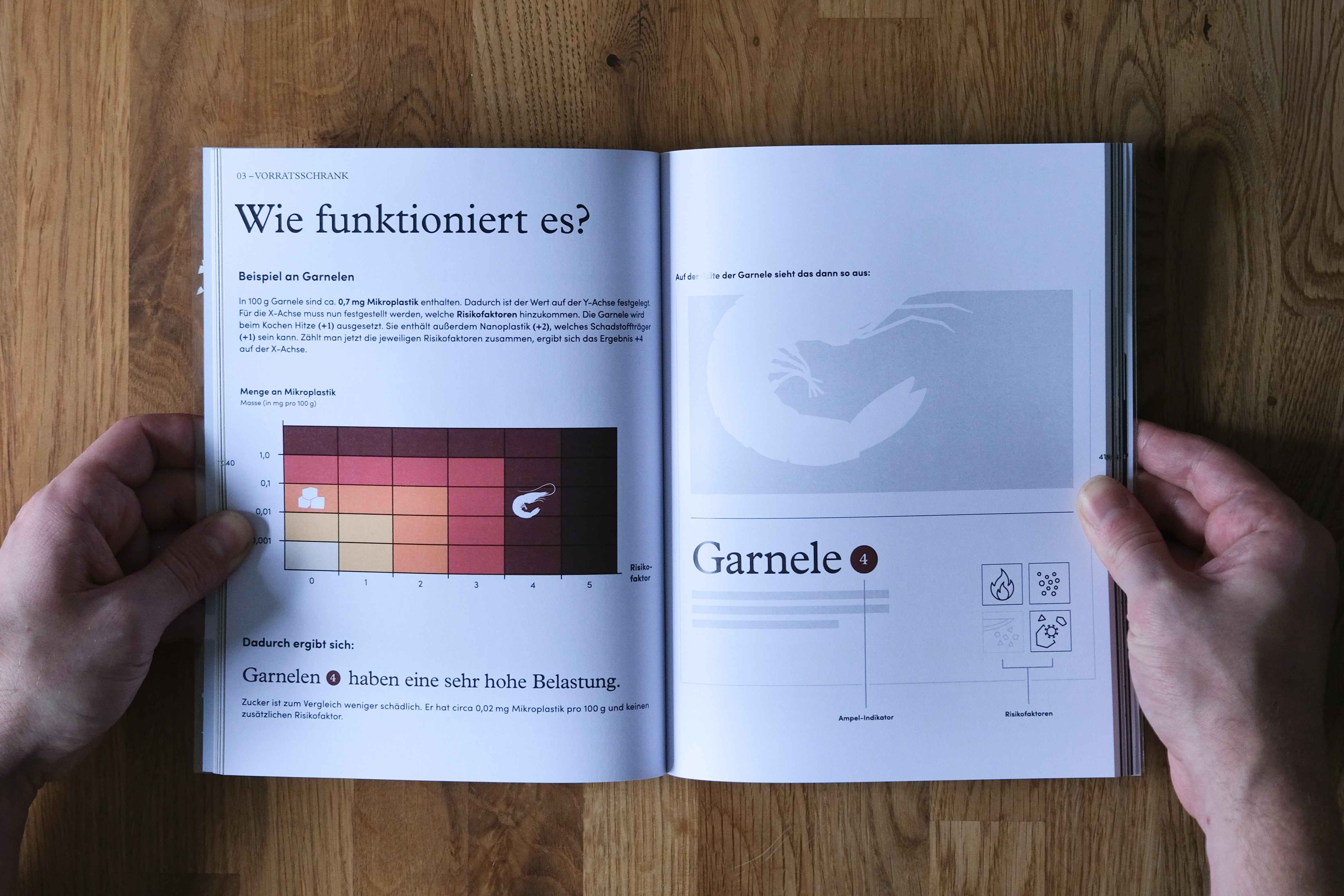 Um das Buch befestigten wir einen Umschlag aus PET-G. Dieser ist transparent und mit weisser Farbe bedruckt. Durch ihn erhält das Cover zusätzliche Informationen. Zum einen bildet sich dadurch eine Fragestellung auf dem Cover sowie einen Einleitungstext auf der Rückseite. Zum anderen erkennt man Mikroplastikpartikel auf den einzelnen Lebensmitteln. Durch das umblättern der transparenten Seite fällt das alles weg.
